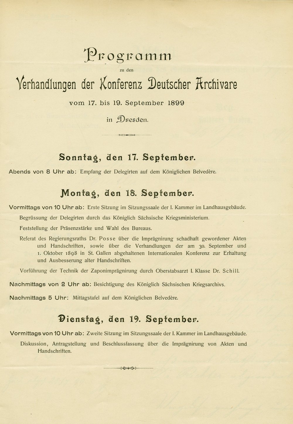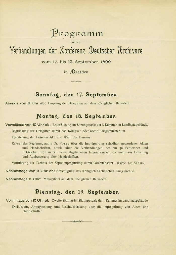 1898 hatte eine internationale Konferenz zur Erhaltung und Restaurierung alter Handschriften in St. Gallen stattgefunden. Die Königlich-Sächsische Regierung entsandte den Oberregierungsrat Dr. Otto Adalbert Posse (1847-1921) nach St. Gallen. Er hatte dort die Aufmerksamkeit auf das von Oberstabsarzt Dr. Ernst Georg Schill (1852-1925) aus Dresden erfundene Zapon-Verfahren gelenkt. Der Name “Zapon“ ist willkürlich gewählt. Es basiert auf der Grundlage von Nitrocellulose, die bereits 1848 entdeckt worden war (Zaponlack ist ein Nitrolack). 1899 trafen sich Archivare aus allen Teilen Deutschlands in Dresden, um über das Verfahren zu beraten. Dr. Posse ging in seiner Rede vom 18. September 1899 vor den Teilnehmern der Dresdner Konferenz auf die Ergebnisse der Konferenz in St. Gallen ein und stellte die verschiedenen in St. Gallen besprochenen Konservierungsmethoden vor.