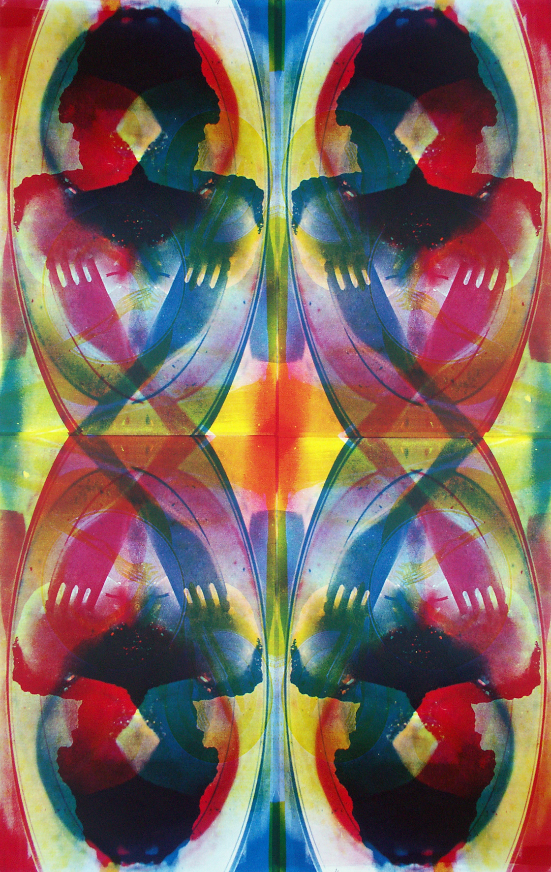 Karin Heynes druckgrafische Arbeiten basieren auf fotografischen Stillleben, Notaten von Alltagssituationen wie einem Mittagessen oder dem Abwasch im Spülbecken. In mehreren Etappen überträgt sie die Schwarzweißfotografien in das Medium des farbigen Siebdrucks. So entsteht aus profanem Alltagschaos ein Kosmos kaleidoskopartiger Spiegelungen.