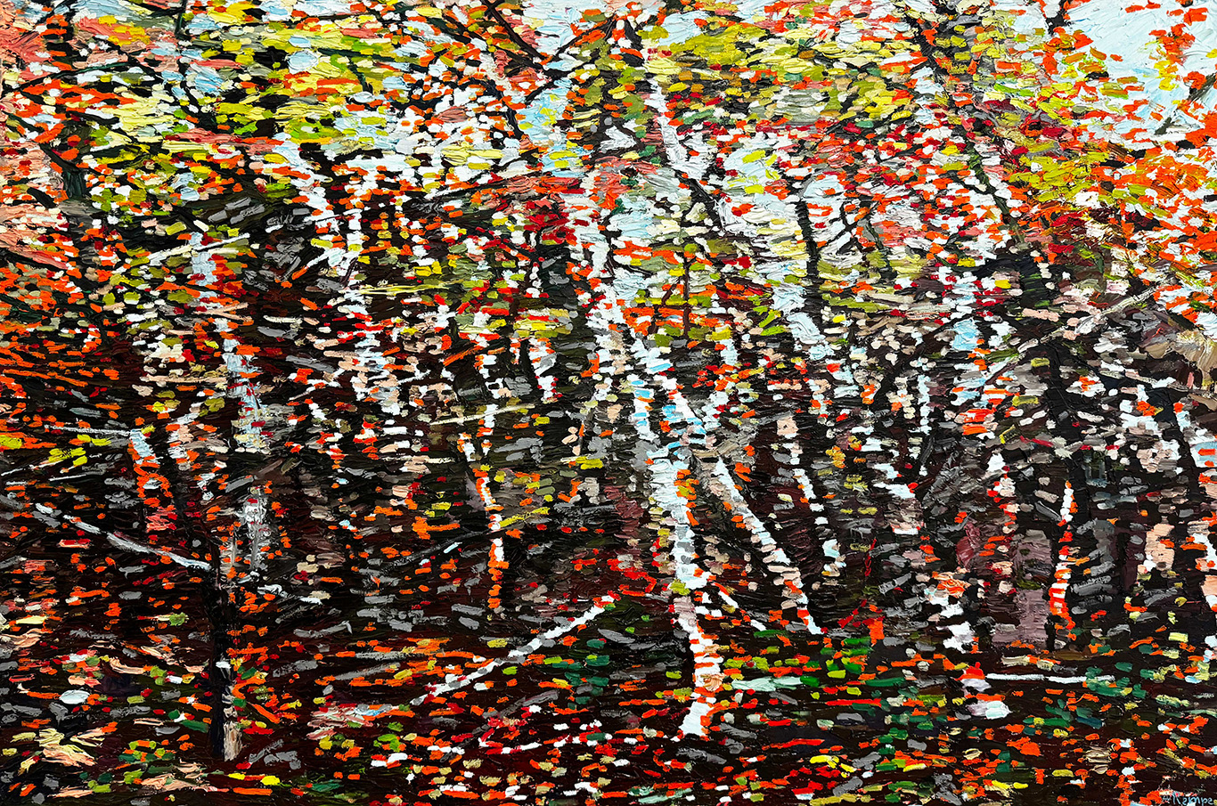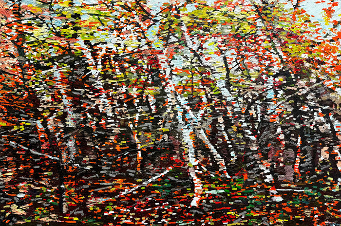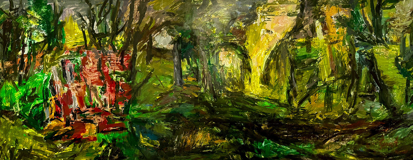 Gerrit Höfig: „Schon seit meiner Jugend ist es mir ein Bedürfnis, in der Natur künstlerisch zu arbeiten. Die Dynamik der Linie, die Spannung der Räume und die intimen Gesten der Bäume und Büsche regen mich in meiner bildnerischen Arbeit an und finden so ganz persönliche Formen und Farben. Zugleich kommt immer mehr in mein Blickfeld, dass wir in einer Industrielandschaft leben, die von Menschen genutzt und vernutzt wird. Diese Eindrücke fließen ebenfalls in meine Bilder ein.“