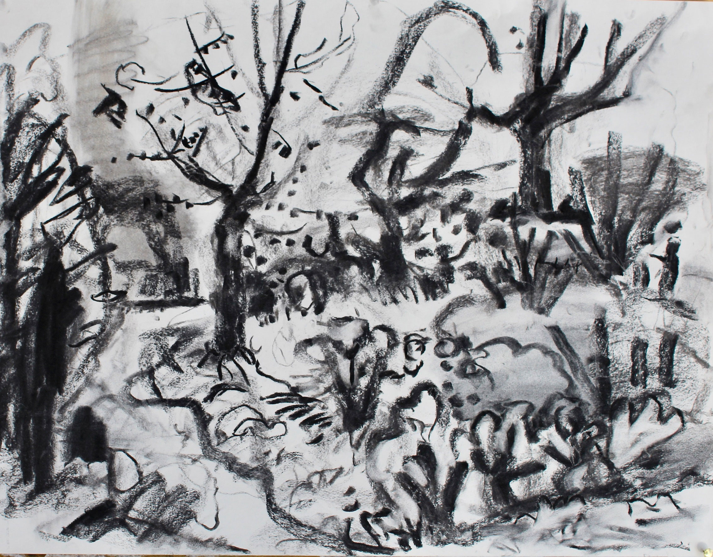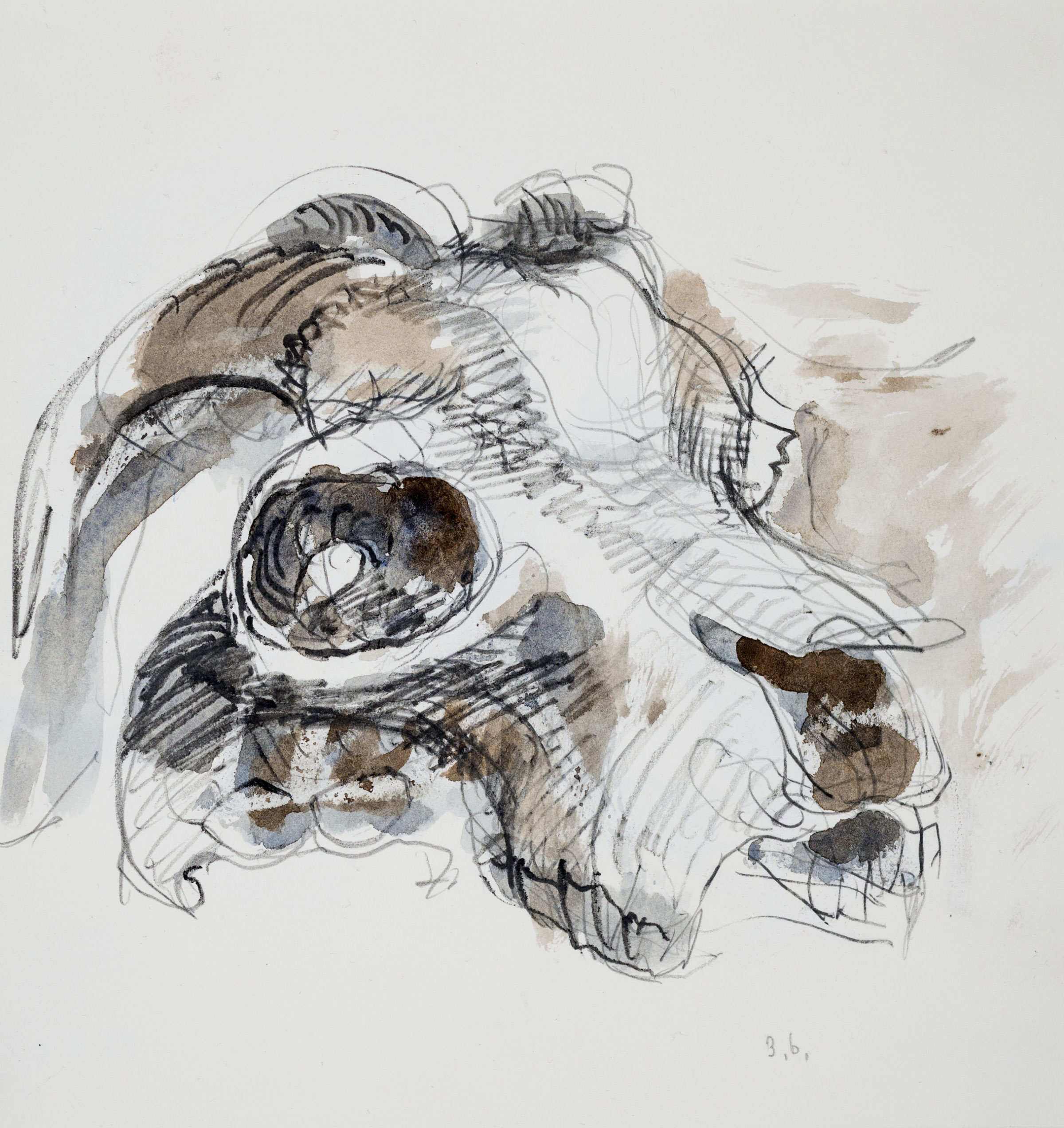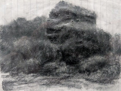 Angelika Becher: „Meine Zeichnungen sind Skizzenbüchern entnommen, die mich auf meinen Streifzügen durch die Natur begleiten. Sie sind tagebuchartig angelegt und spiegeln das bei der Betrachtung der Natur unmittelbar Erlebte wieder. Ich besuche ganz bestimmte Orte immer wieder, so dass ein einmal gefundenes Motiv täglich neu entdeckt und über lange Zeiträume (auch Jahre) verfolgt werden kann. So entstehen Blätter, die Zeitlosigkeit und Ursprünglichkeit zum Ausdruck bringen und eine den Dingen innewohnende Schrift sichtbar wird.“
