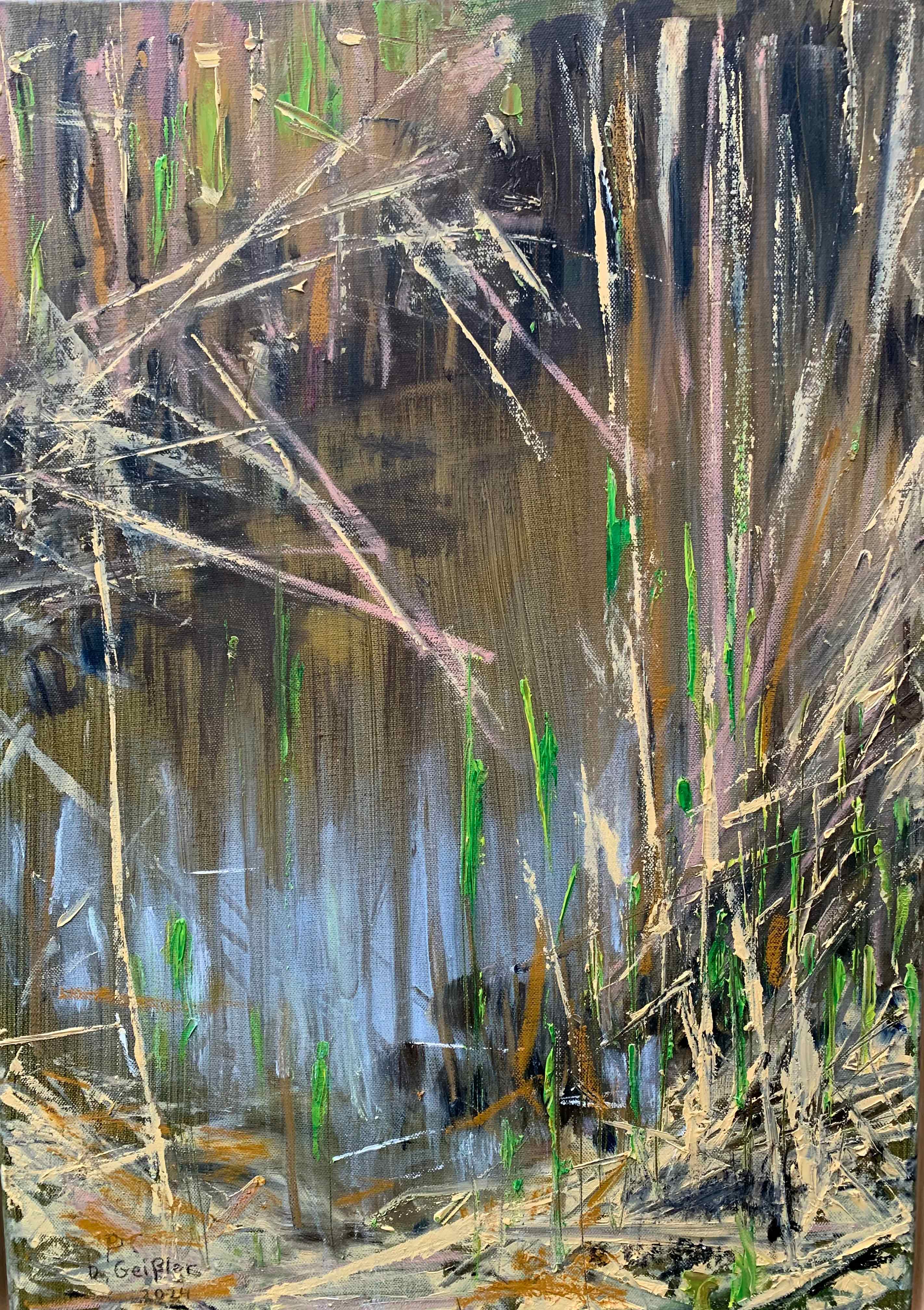 Rita Geißler: „Als Malerin/Grafikerin liegt der Schwerpunkt meiner Arbeit auf Druckgrafik. Meine bevorzugte Technik ist Radierung bzw. Tiefdruck, wo ich gerne experimentiere. Vorlagen sind Aquarelle, Pastelle und Zeichnungen, die direkt in der Natur entstanden sind. Zunehmend male ich auch Öl- und Acrylbilder. Meine grafischen Arbeiten haben zum Teil eine Tendenz zu Abstraktion und Reduktion. Gemeinsam ist besonders den grafischen Arbeiten der Versuch, in den Motiven Gesetze und Rhythmen aufzuspüren, die allem Natürlichen und Menschlichen gleichermaßen zugrunde liegen.“