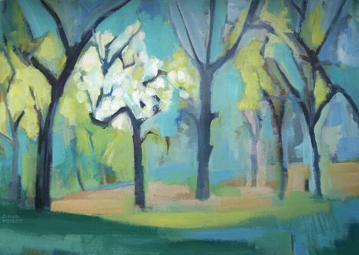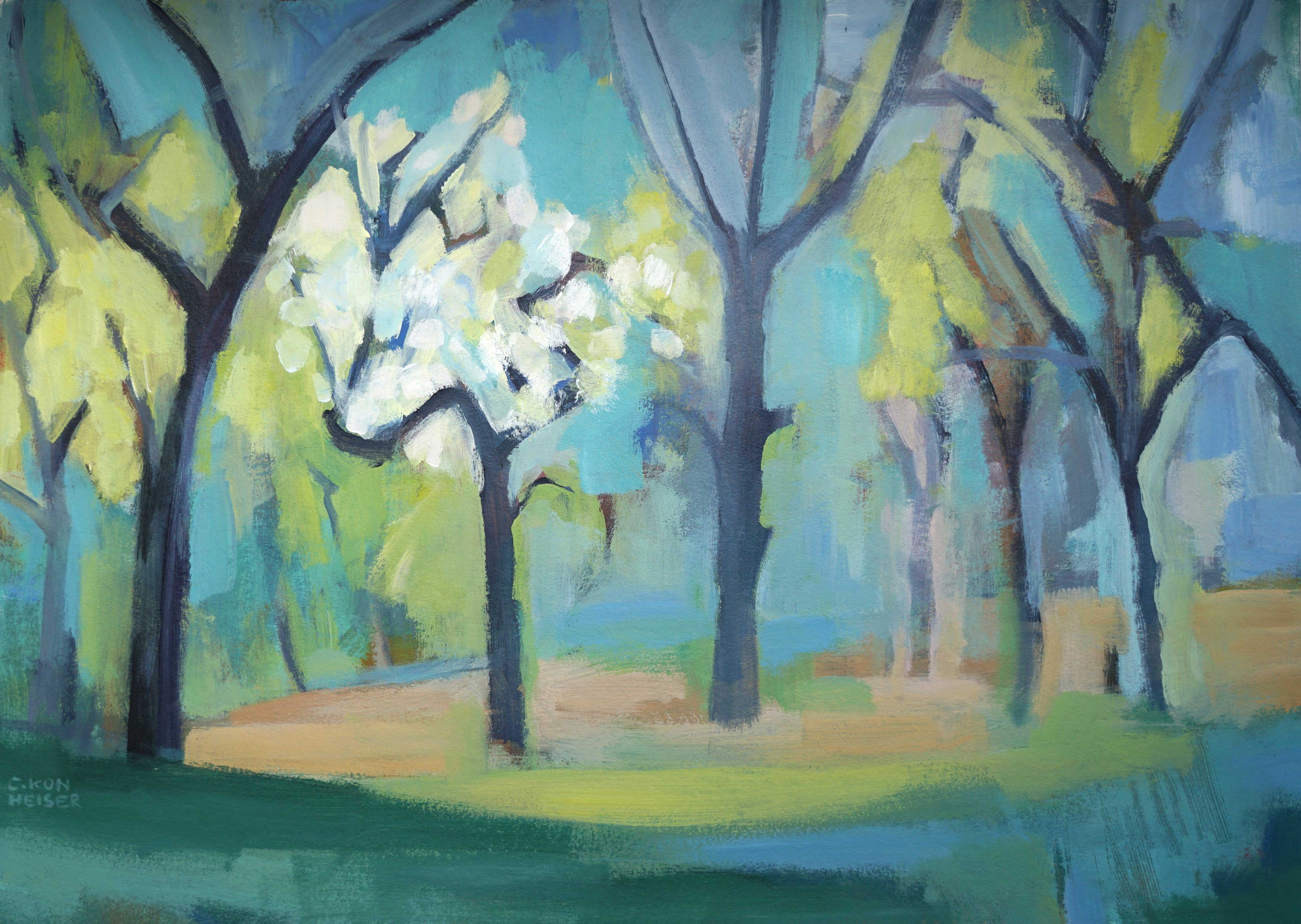 Cornelia Konheiser: „Die Inspirationsquelle meiner künstlerischen Arbeit liegt in der Natur. Während ich mich in meinen druckgrafischen Arbeiten dem Abbild der Natur mehr und mehr zu entziehen versuche und mich eher den Phänomenen und inneren Prozessen derselben zuwende, erliege ich in meiner Malerei ihrer Schönheit, besonders beim Arbeiten direkt in der Landschaft. Dann bin ich überwältigt von ihrer Unmittelbarkeit, dem Zusammenspiel von Formen, Farben und Strukturen. Dennoch ist es mir wichtig, kein Abbild, sondern bestenfalls einen Ausdruck von Poesie zu erzeugen, so dass ein geheimnisvolles Etwas entsteht, was mitschwingt.“
