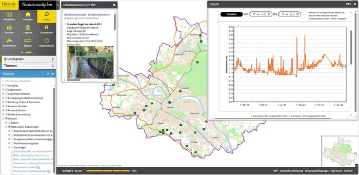 Das Thema „Oberflächenwasser – aktuelle Messwerte“ ist im Themenstadtplan über die Themengruppe Umwelt und den Unterpunkt Hochwasser & Starkregen erreichbar. In der Diagrammansicht können beliebige Zeiträume ausgewählt und Daten heruntergeladen werden. Die Messstellen sind mit automatischen Sonden zur Wasserstandsmessung ausgerüstet und übertragen die Messwerte per Funk in die Datenbank der Landeshauptstadt Dresden. Es handelt sich um ungeprüfte Rohdaten. Zusätzlich stehen an einigen Messstellen Kamerabilder zur Verfügung, die in Echtzeit die Situation an der Gewässer-Messstelle zeigen.