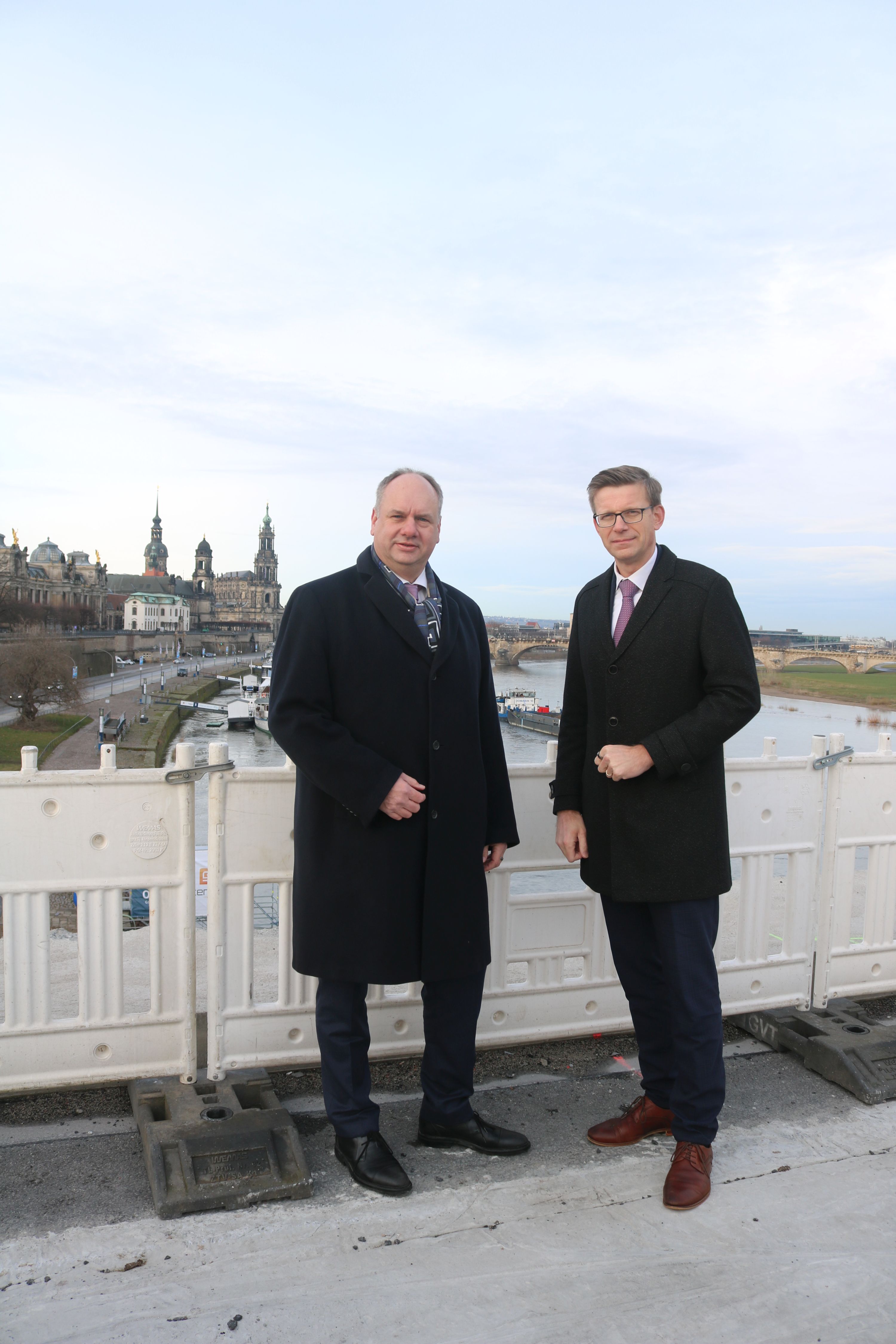 Tschechiens Verkehrsminister Martin Kupka informiert sich bei Oberbürgermeister Dirk Hilbert über den Rückbau der Carolabrücke