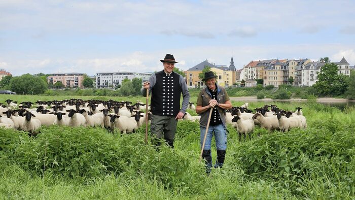 Für die Pflege der Elbwiesen setzt die Stadt nicht nur auf Maschinen, sondern auch auf Tiere. Seit 1992 sorgen rund 600 Schwarzkopf- und Suffolk-Schafe dafür, dass die Elbwiesen in einem guten Zustand sind und die Dresdnerinnen und Dresdner zum Verweilen einladen. Das Umweltamt arbeitet dafür eng mit Schäfer Steffen Vogel zusammen. Jahr für Jahr zieht er mit seiner Herde von Weixdorf bis zur Hofewiese in die Dresdner Heide. Von dort geht es weiter zu den Elbwiesen an der Waldschlösschenbrücke und letztendlich auf die andere Elbseite ins Ostragehege, wo die Tiere kürzlich angekommen sind. Eine kleinere Herde kümmert sich um die natürliche Landschaftspflege auf dem Dresdner Heller.
