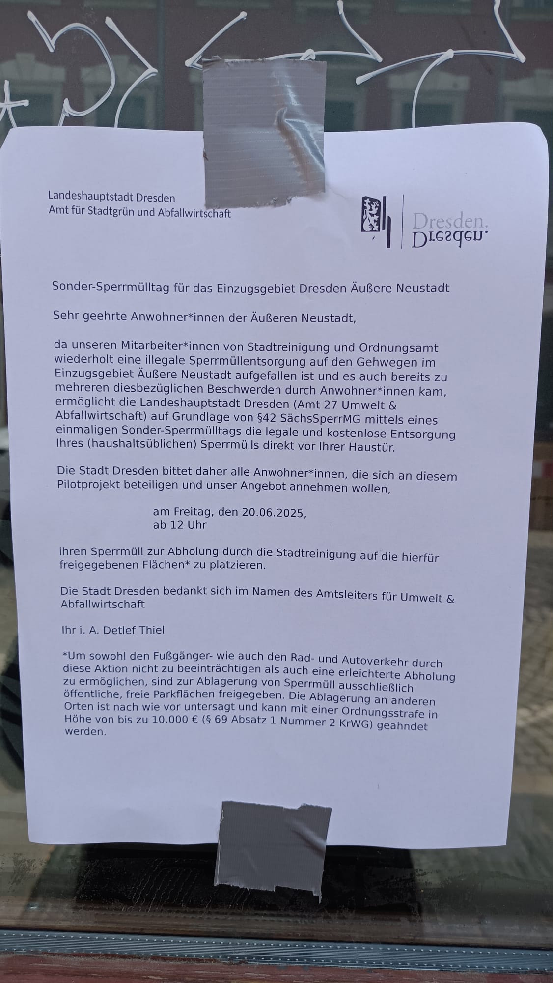 In den Straßen der Dresdner Neustadt laden verschiedene Hausaushänge zum „Sonder-Sperrmülltag“ oder zur Schrott- und Elektro-Altgerätesammlung am Freitag, 20. Juni 2025, ein. Bei diesen Aushängen, die unter anderem im Namen der Landeshauptstadt Dresden verfasst sind, handelt es sich jedoch um Fälschungen. Darauf weist das Amt für Stadtgrün und Abfallwirtschaft hin. Die Landeshauptstadt Dresden appelliert deshalb an alle Anwohner, nicht auf diese Art Aushänge zu reagieren und die geforderten Abfälle nicht auf die Straße zu stellen. Das Herausstellen würde nicht nur zur Vermüllung der Straßen in der Neustadt beitragen, sondern auch die am kommenden Wochenende stattfindenden Straßenfeste behindern.
