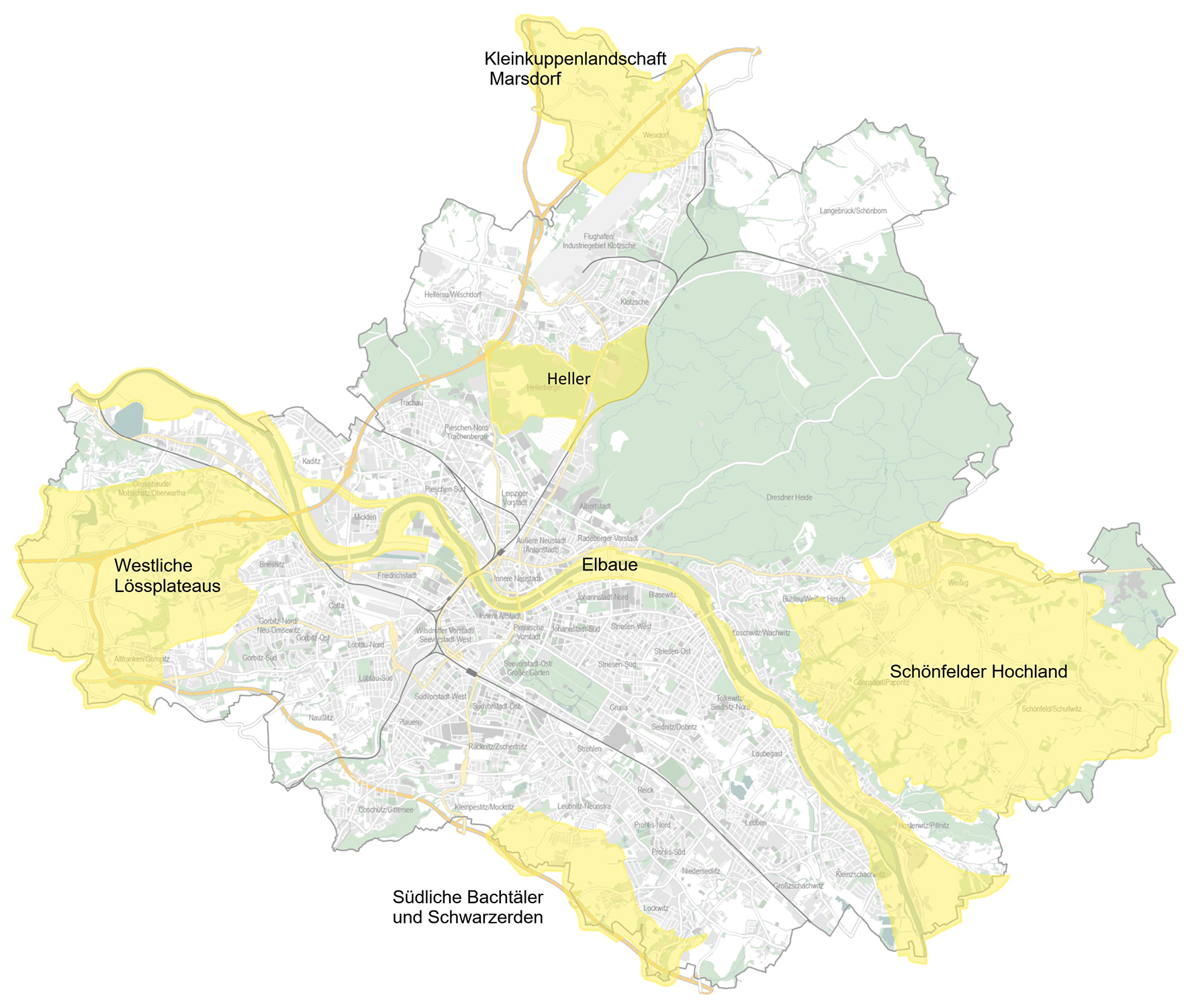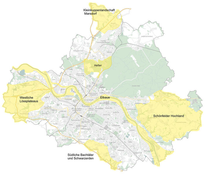 Zu den sechs Schwerpunktgebieten gehören die Elbaue, der Heller, das Schönfelder Hochland, die Kleinkuppenlandschaft Marsdorf, die Lössplateaus westlich von Briesnitz und Gorbitz sowie die südlichen Bachtäler und Schwarzerden-Gebiete bei Leubnitz-Neuostra und Lockwitz.
