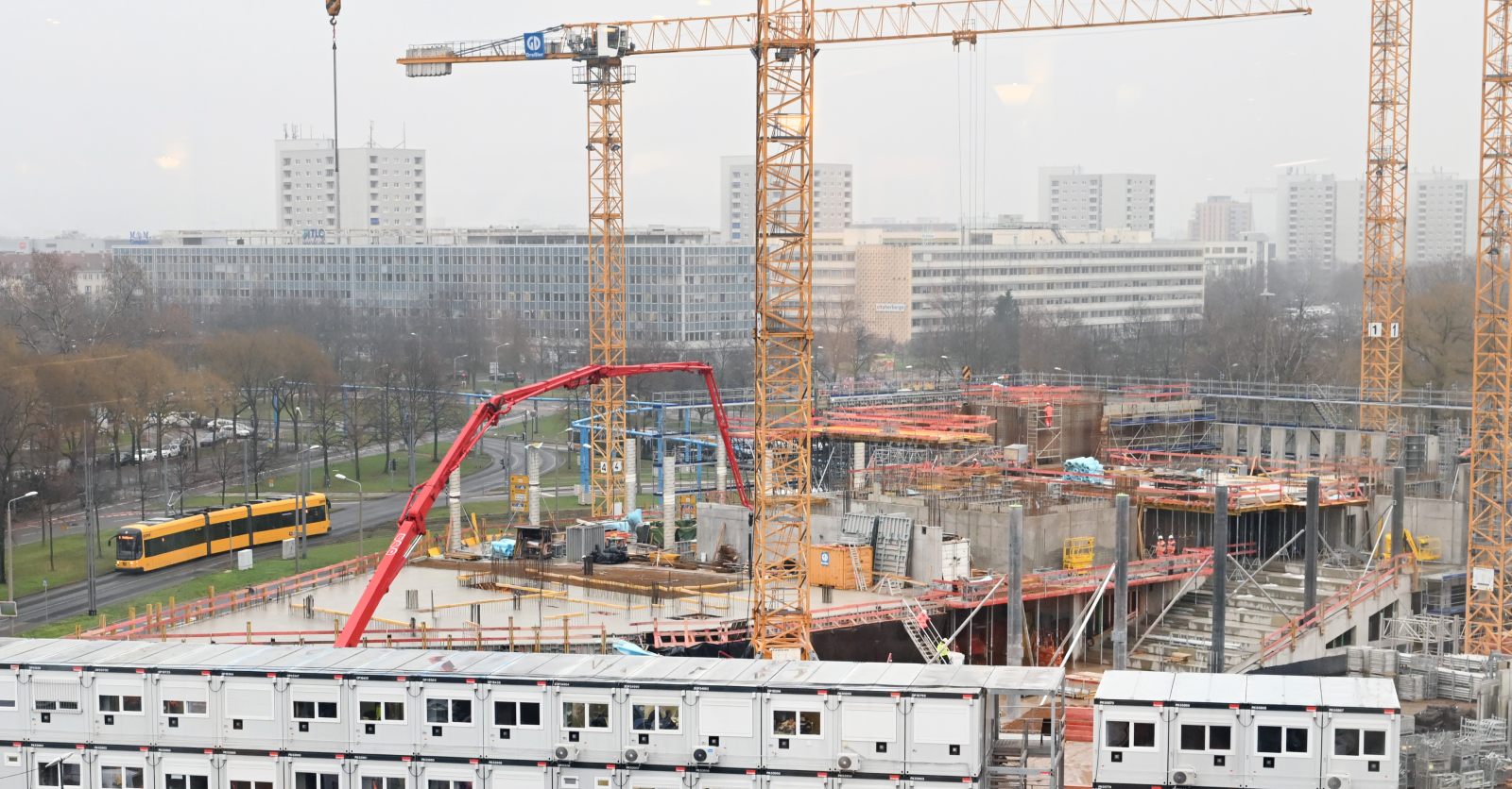 Auf der Baustelle des Stadtforums sind etwa 45 Menschen und vier Turmdrehkräne von Montag bis Samstag im Zwei-Schicht-Betrieb im Einsatz. Nachdem die Decken über dem Erdgeschoss fertiggestellt wurden, arbeiten die Fachleute nun unter anderem an den Wänden und Stützen im ersten Obergeschoss. Im Spätsommer 2023 soll der Rohbau mit der Fertigstellung des sechsten Obergeschosses planmäßig abgeschlossen sein.