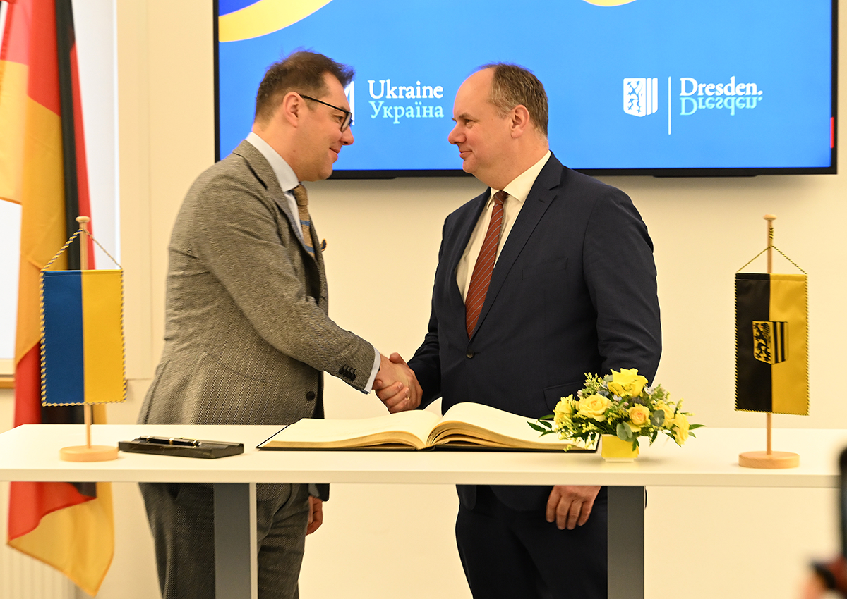 Besonderes Interesse seitens des Botschafters rief die Ankündigung von Oberbürgermeister Hilbert hervor, dass die Landeshauptstadt Dresden eine „Gemeinsame Solidaritätspartnerschaft der Städte Dresden, Stuttgart und Straßburg“ mit Chmelnyzkyj in der Westukraine plant. Chmelnyzkyj und Dresden sind bereits durch ihre gemeinsame Mitgliedschaft in der Arbeitsgemeinschaft der Europapreisträgerstädte verbunden. Deshalb kontaktiere Dresden die ukrainische Stadt. Gleichzeitig hatte sich auch Stuttgart – ohne bis dahin vom Dresdner Kontakt zu wissen – auf Chmelnyzkyj fokussiert. So entstand die Idee einer gemeinsamen Solidaritätspartnerschaft, die schnell auf die gemeinsame französische Partnerstadt Straßburg ausgeweitet wurde. In allen Städten wird zeitnah eine Vorlage in die jeweiligen Stadt- und Gemeindeparlamente eingebracht, so dass nach den entsprechenden Beschlussfassungen eine gemeinsame Unterzeichnung durch die vier Städte im Frühsommer geplant werden kann. Die Dresdner Vorlage des Oberbürgermeisters zur Solidaritätspartnerschaft geht aktuell in den Ämterumlauf. Ziel ist es, zeitnah einen Beschluss im Stadtrat herbeizuführen.
