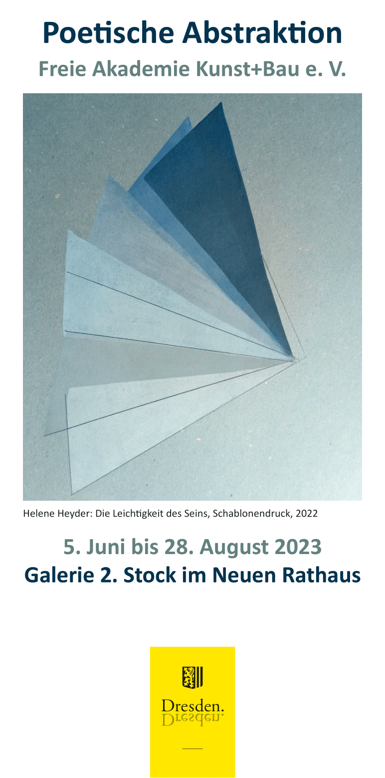 Die zweite Ausstellung der Jahresreihe „Abstraktion in der Dresdner Kunst der Gegenwart“ des Freie Akademie Kunst+Bau e. V. steht ganz im Zeichen der „poetischen Abstraktion“. Zu sehen sind Arbeiten von Michael Freudenberg, Susanne Hampe, Thomas Hellinger, Helene Heyder, Claudia Kleiner und Jens Küster. Diese sechs Dresdner Kunstschaffenden verbindet eine abstrakte Bildsprache, die losgelöst von figürlicher Darstellung auf weitestgehend freier Formgebung gründet. Mitunter folgen Komposition und Rhythmisierung der Bildfläche musikalischen Einflüssen. Ausführung und Prozess innerhalb des jeweiligen Genres, sei es Malerei, Papierschnitt oder Drucktechnik, sind von entscheidender Bedeutung für das finale Werk. Ebenso werden das Zulassen des Zufalls, von Negativ-Räumen und Unregelmäßigkeiten im Malgrund zum integrativen Bestandteil der Werkentstehung.