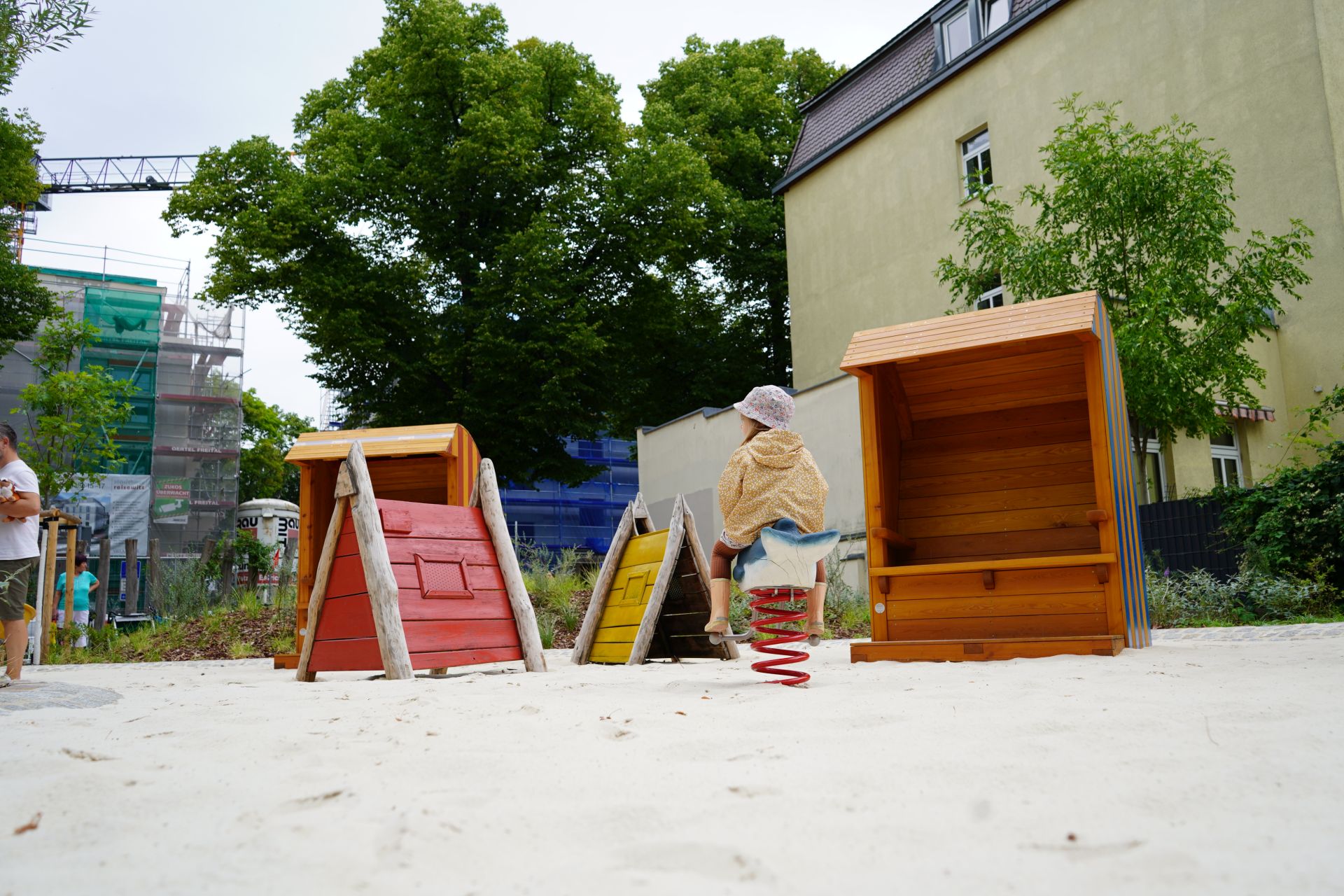 Mit Mitteln der Städtebauförderung für das Sanierungsgebiet Löbtau wurde die Planungsarbeit für den neuen Spielplatz finanziert. Die Planer des Büros freiraumentwicklung ehrler aus Dresden griffen das Thema Strand auf, übernahmen beliebte Bestandselemente sowie den besonders weißen Sand und passten die Planung an die Gegebenheiten vor Ort an. Es entstand eine zweite Sandfläche. Einige Attraktionen sind barrierefrei zugänglich. Der Spielturm erhielt eine kleine Rutsche und auch das Boot kann nun anders als bisher bespielt werden. Zelte, Wellenschaukel, Hängematten, Fischwippe und Drehling wurden vom früheren Spielplatz umgesetzt und saniert. Strandkörbe und weitere Sitzgelegenheiten laden zum Ausruhen ein.