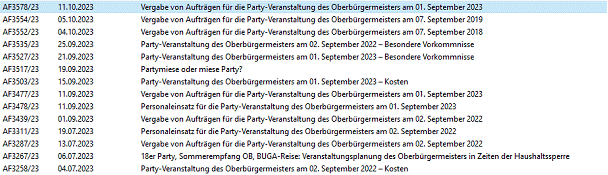 Hier nur ein Auszug aus der Übersicht der Anfragen des Stadtrates Schollbach – nur für 2023. Darüber hinaus gab es mit Start der Party gleichlautende Anfragen, aus denen hervorgeht, dass der Stadtrat bereits 2018 alle Informationen zu den Ausschreibungen und Aufträgen vorliegen hat. Die aktuelle Kommunikation ist also nur ein aufwärmen alter Fakten. Übersicht siehe Anlage.