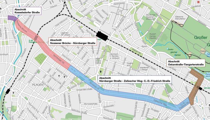 Schon in den vergangenen Jahren wurden vorbereitende Maßnahmen für das Großprojekt entlang der Nossener Brücke und Nürnberger Straße umgesetzt und verschiedene Strecken saniert, die während des Baus als Umleitungsstrecken dienen. So zum Beispiel die Würzburger Straße und die Zwickauer Straße.