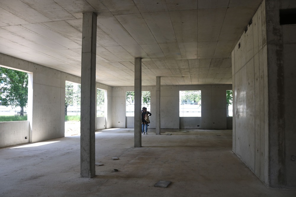 Nach dem Rohbau folgen nun die Abdichtungsarbeiten am Dach des zweigeschossigen Gebäudeteils. Dieses erhält eine extensive Begrünung kombiniert mit einer Photovoltaikanlage. Die Dachterrasse wird mit verschiedenen Gehölzen und Sträuchern bepflanzt und mit Sitzmöglichkeiten, einer Pergola und einer Bühne versehen. Die Freianlagen um das Gebäude werden ebenfalls mit Sitzmöglichkeiten sowie einer Tischtennisplatte ausgestattet. Dazu kommen ein Gerätehaus, Fahrradbügel und Stellplätze für Lastenfahrräder sowie ein Raku-Brennplatz, notwendig für diese spezielle Brenntechnik beim Töpfern. Es werden Pflanz- und Rasenflächen angelegt und sieben Bäume gepflanzt.
