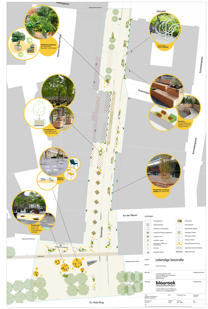 Von Juli bis Oktober wird die Seestraße zwischen dem Altmarkt und dem Dr.-Külz-Ring versuchsweise zur Fußgängerzone. In dieser Zeit sind die Verkehrsflächen nur noch dem Fuß- und Radverkehr sowie der Anlieferung vorbehalten. Der restliche Autoverkehr muss draußen bleiben. Unter dem Motto „Stadtraum anders gestalten“ wird die Straße mit Bäumen, Pflanzbeeten und verschiedenen Sitzelementen ausgestattet. Das zusätzliche Grün soll den Aufenthalt in der im Sommer oft überhitzten Innenstadt angenehmer machen sowie zum Schlendern, Radeln und Verweilen einladen.