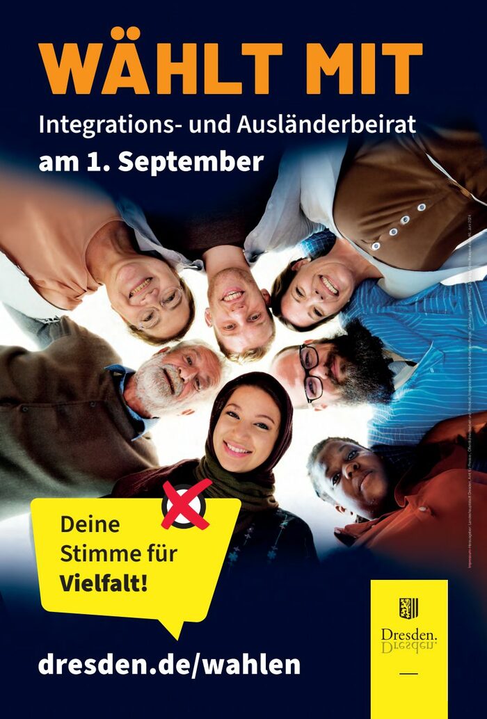 Am Sonntag, 1. September 2024, findet die Wahl des Dresdner Integrations- und Ausländerbeirates statt – zeitgleich zur Wahl des Sächsischen Landtages. Etwa 55.000 Wählerinnen und Wähler mit ausländischer Staatsangehörigkeit aus Dresden sind per Briefwahl aufgerufen, ihre Vertreterinnen und Vertreter für den Integrations- und Ausländerbeirat zu wählen. Für eine hohe Wahlbeteiligung werben ab morgen, Dienstag, 9. bis Dienstag, 23. Juli 100 städtische City-Light-Plakate unter dem Motto „Wählt mit“ im gesamten Stadtgebiet. Die Wahlbriefe werden ab Ende Juli bis Mitte August verschickt. 28 Kandidierende wurden zur Wahl zugelassen und stehen auf dem Stimmzettel. Damit die Wählerinnen und Wähler die Kandidierenden besser kennenlernen können, gibt es vier Vorstellungsrunden. Hier stellen die Kandidierenden sich und ihre Programme persönlich vor: