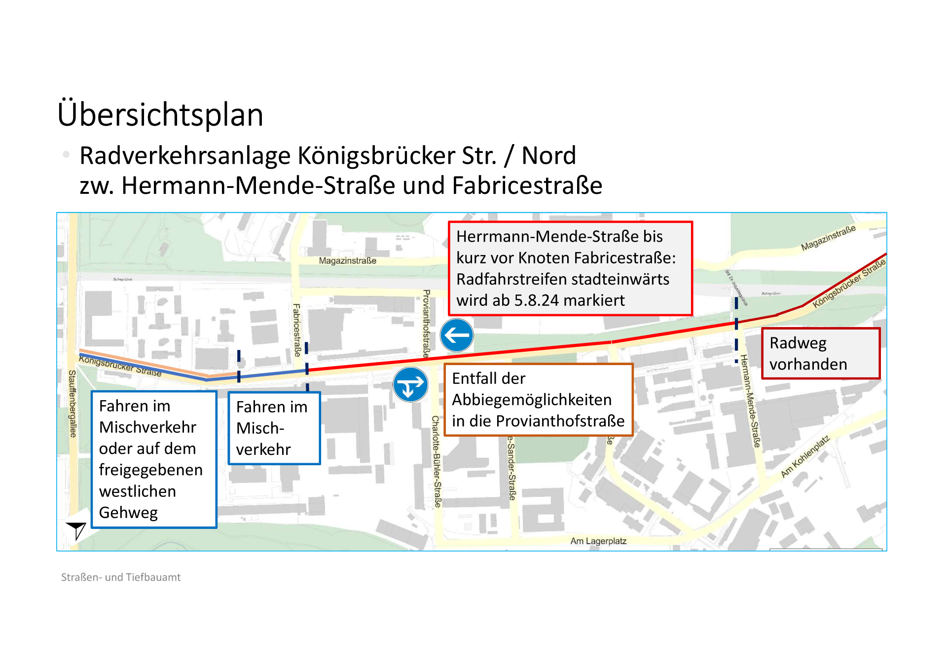 Im Bereich zwischen Hermann-Mende-Straße und Fabricestraße gibt es nur auf der östlichen Seite der Königsbrücker Straße einen Gehweg. Dieser war bisher für die Benutzung durch Radfahrer aus beiden Richtungen freigegeben. Hier gab es viele Konflikte zwischen Radfahrern, Fußgängern und ein- bzw. ausbiegenden Kraftfahrzeugen. Diese führten zu Unfällen, zum Teil mit Personenschaden. Daher wird nun die Freigabe des östlichen Gehwegs für Radler stadteinwärts aufgehoben. Die Kosten betragen rund 85.000 Euro. Die Firmen ASS Verkehrsservice und Walther Fahrbahnmarkierung führen die Leistungen aus.