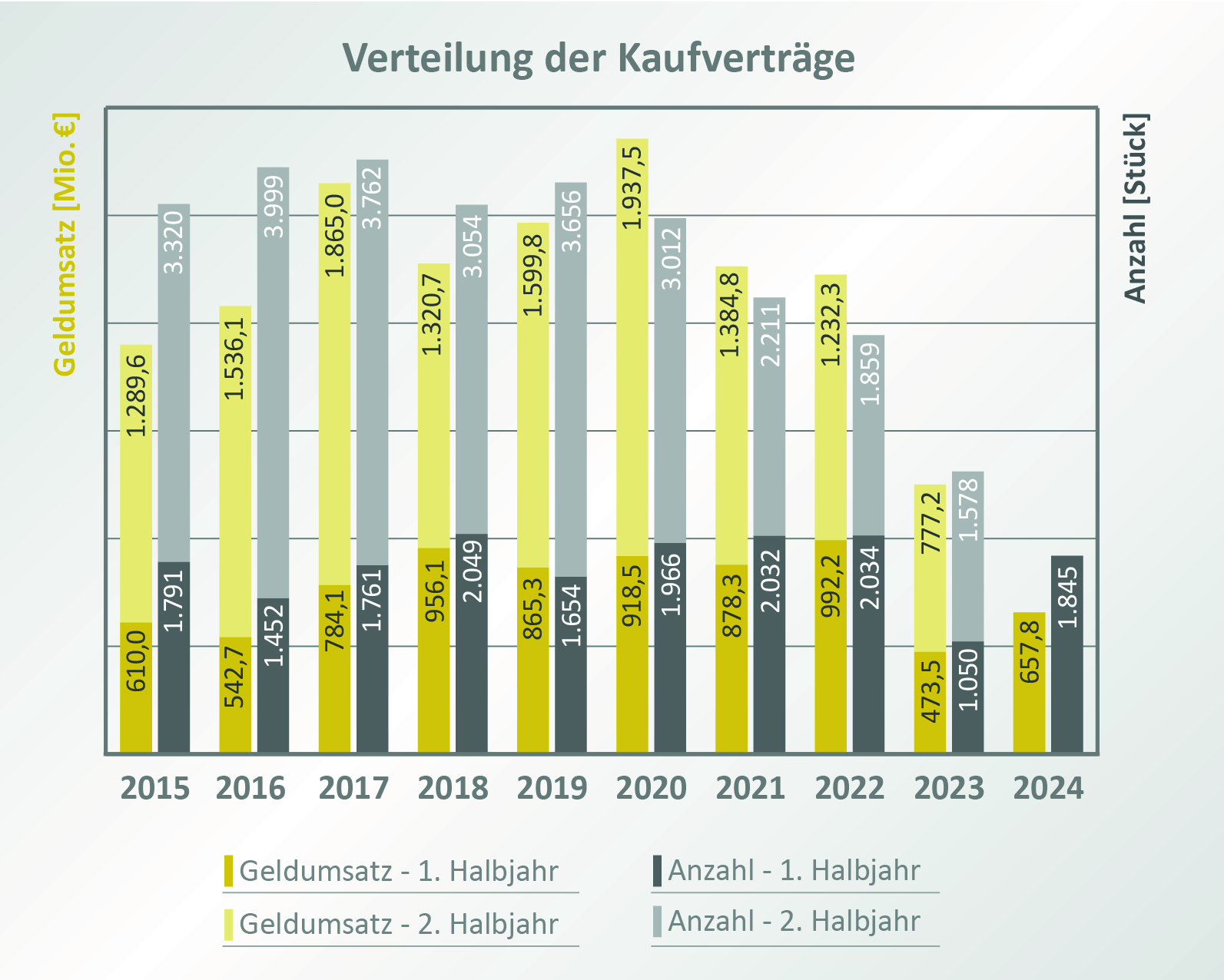 Im Teilmarkt bebauter Grundstücke konnte ein verstärkter Handel festgestellt werden. Die Anzahl registrierter Kaufverträge stieg gegenüber dem ersten Halbjahr 2023 um rund 52 Prozent von 215 auf 327. Dennoch konnte der Geldumsatz nicht ganz die Höhe des ersten Halbjahres 2023 erreichen und sank von 295 Millionen Euro auf rund 288 Millionen Euro. Dass trotz gestiegener Transaktionszahlen der Geldumsatz gesunken ist, liegt am Fehlen von Paketverkäufen mit hohem Geldumsatz.