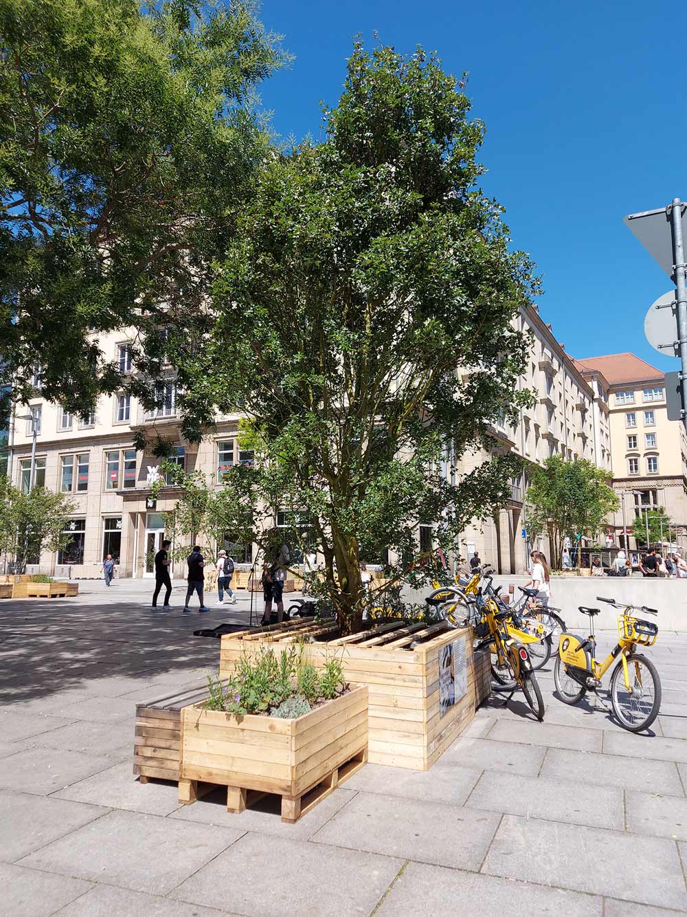 Die Landschaftsarchitekten des Büros Blaurock„Die Seestraße liegt im Zentrum von Dresden und verbindet den Altmarkt und die Prager Straße. In einem Verkehrsversuch ist der bisher als Straßenraum geprägte Ort durch temporäre Maßnahmen über die warmen Monate hinweg zum Lebensraum für Anwohnerinnen und Anwohner und Passanten geworden. Um den Fuß- und Radverkehr zu fördern, wurde die Straße zur Fußgängerzone. Lediglich Rad- und Anlieferverkehr sind gestattet. Beete und Bäume zur Begrünung und Sitzmöglichkeiten wurden aufgestellt. Damit ist die Seestraße zu einem lebendigen Raum geworden, der zum Verweilen und Flanieren einlädt und einen Beitrag zum besseren Stadtklima leistet.“