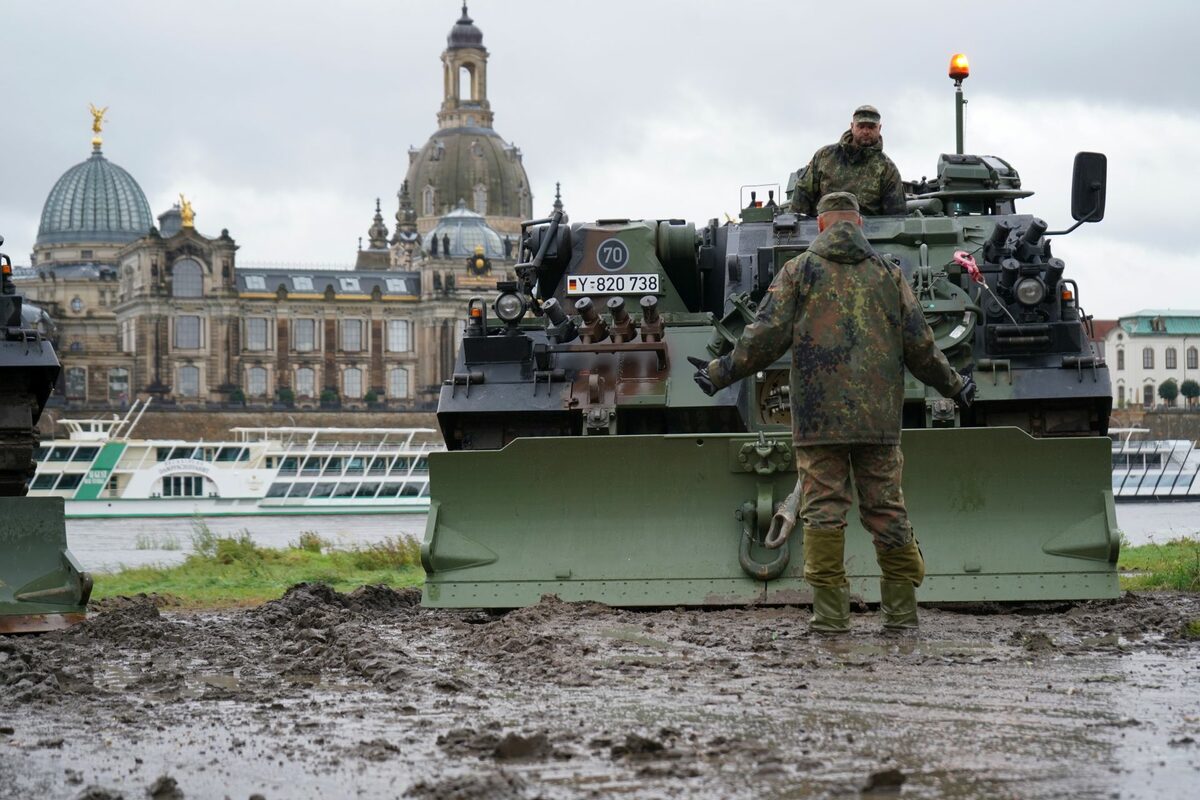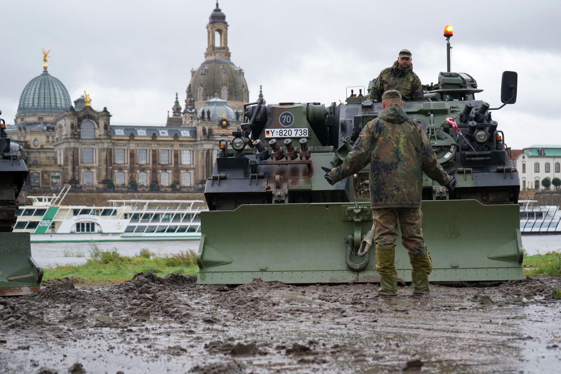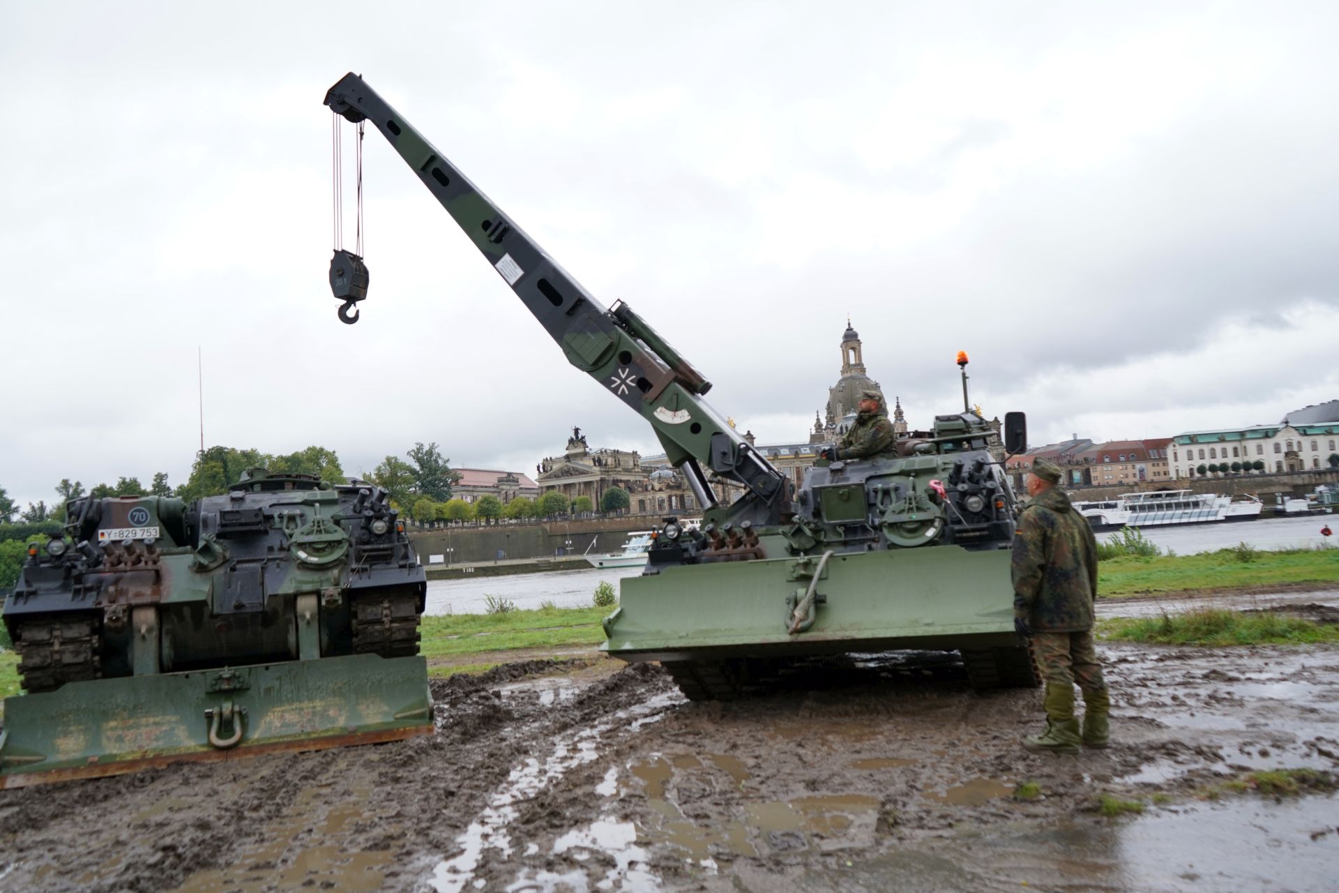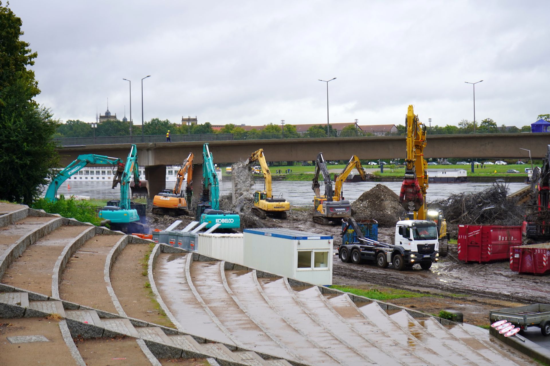 Ein Schwenkarmgerät ist angefordert, um Arbeiten an den oberen Brückenteilen zur ermöglichen. Heute Nachmittag werden auch zwei Bergepanzer der Bundeswehr erwartet, die das Kommando Dresden entsendet. Es sollen so viele Teile der Brücke wie möglich abtransportiert werden. Der Abtransport der Brückenteile wird über den Elbradweg gewährleistet, der kurzfristig verfestig wurde. Gelagert werden die Teile aktuell am Alten Leipziger Bahnhof. Das Amt für Geodaten und Kataster überwacht den Abriss per Drohne. Mitarbeiter des Ordnungsamtes und der Polizei sichern den abgesperrten Bereich ab. Das THW unterstützt die Abbrucharbeiten vor Ort weiterhin mit bei der Überwachung, Sicherung und Beleuchtung.