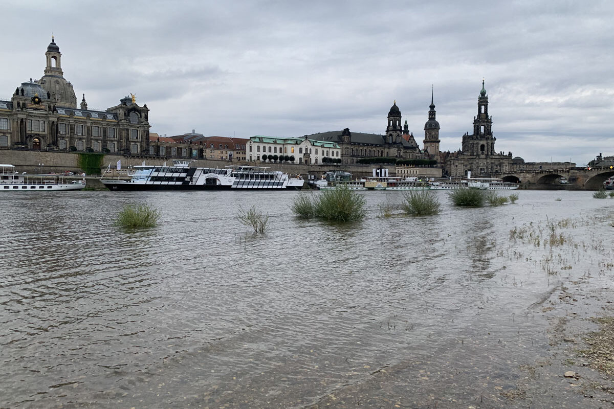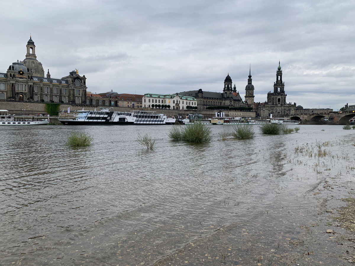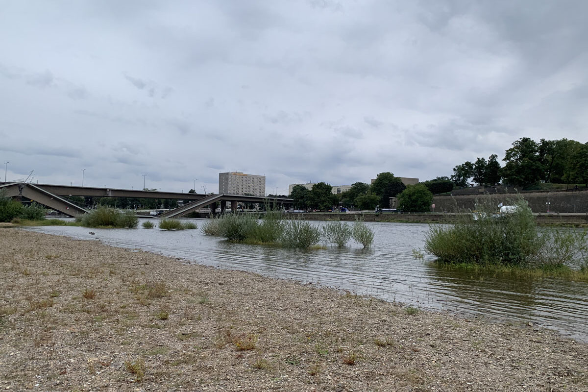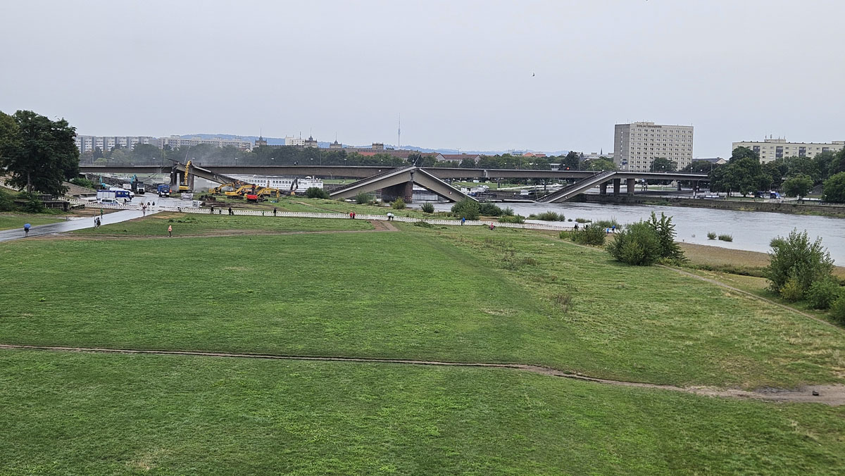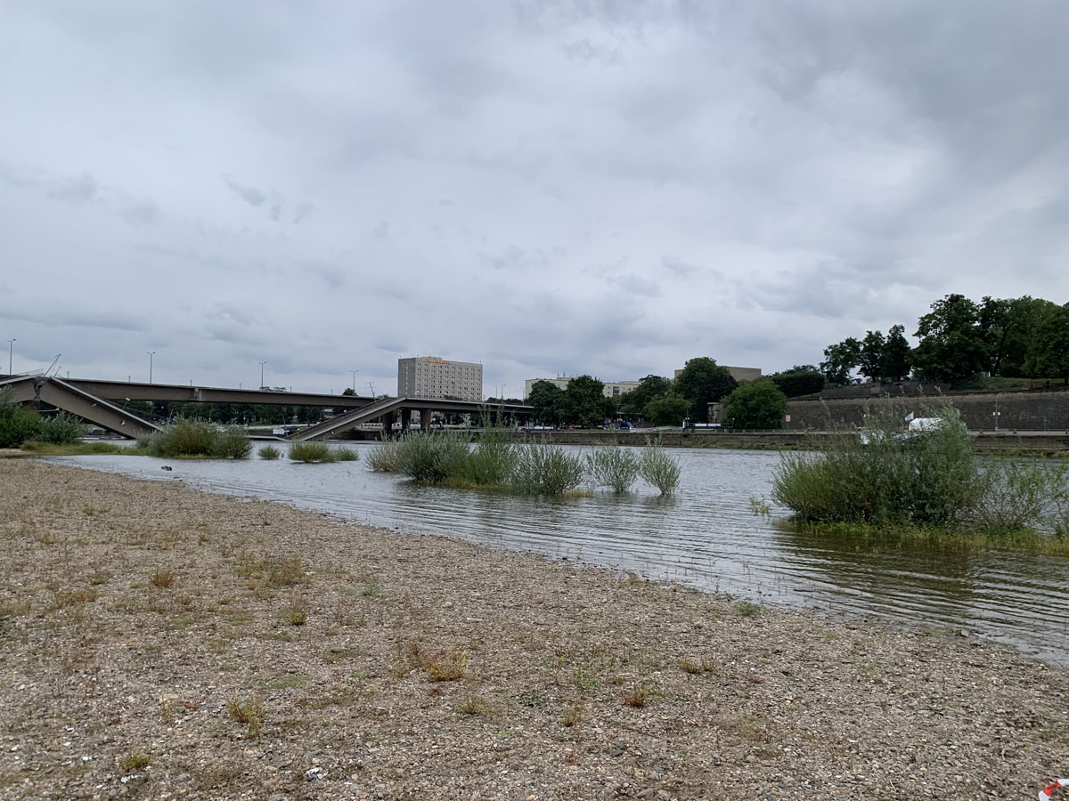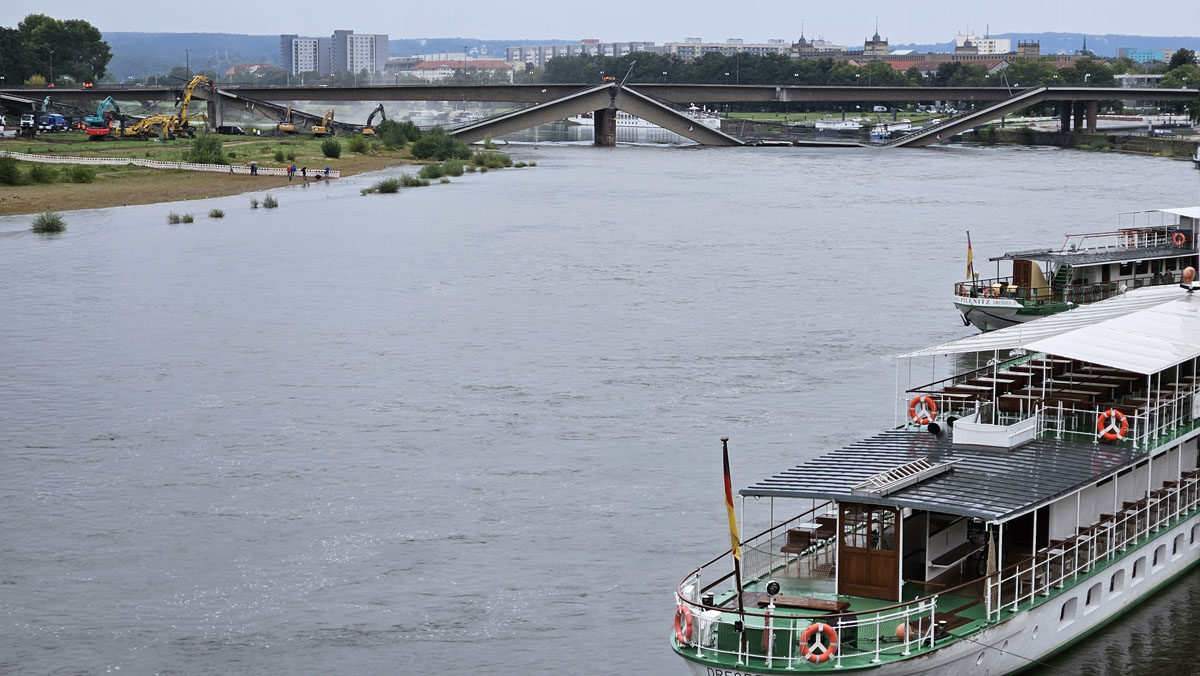 Statiker prüfen gerade, was mit den schräg hängenden Teilen der Brücke auf der Neustädter Seite passiert. Mit Blick auf den steigenden Wasserstand der Elbe wäre es besser, diese würden im flach Wasser liegen. Die Teile des Brückenzuges C auf der Altstädter Seite werden verbleiben, soweit sie nicht selbst fallen.