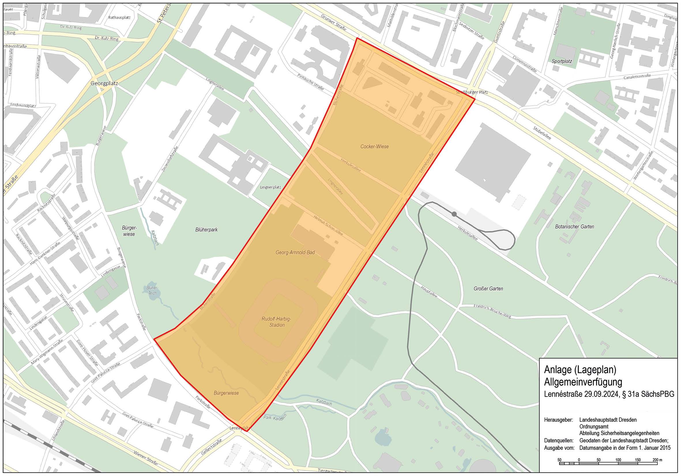 Die Anordnung gilt im Bereich Lennéplatz, Parkstraße in westlicher Richtung bis Einmündung Blüherstraße, Blüherstraße in nordöstlicher Richtung bis zur Grunaer Straße, Grunaer Straße stadtauswärts bis Straßburger Platz sowie Lennéstraße ab Straßburger Platz bis Lennéplatz.