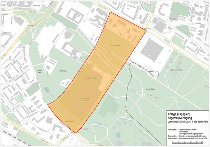 Aufgrund der Einstufung des am Sonntag, 29. September 2024, stattfindenden Fußballspiels der SG Dynamo Dresden gegen Alemannia Aachen als Hochrisikospiel und der entsprechenden Gefahr eines hohen Gewaltpotenzials ordnet die Landeshauptstadt Dresden zur Gefahrenabwehr ein Verbot zum Mitführen bestimmter Gegenstände an.