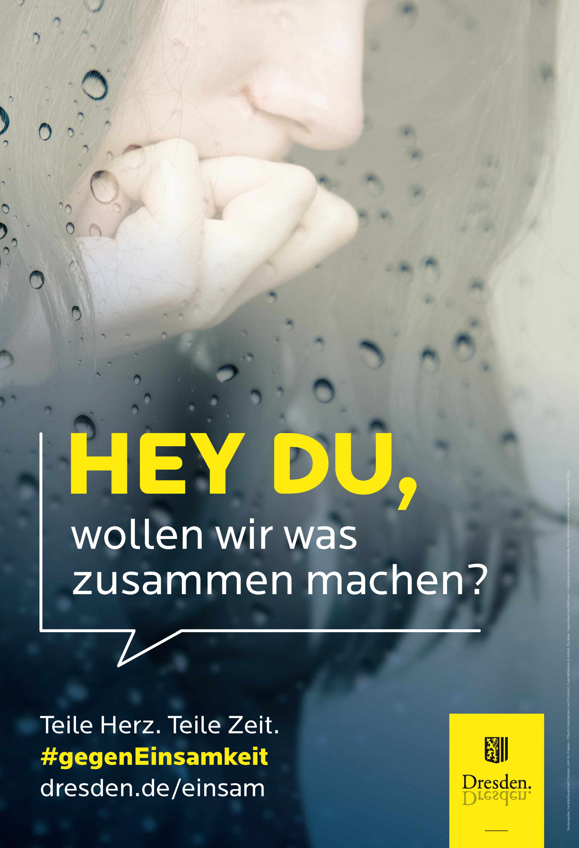Mit einer City-Light-Plakat-Kampagne unter dem Slogan „HEY DU, wollen wir was zusammen machen?“ weist die Landeshauptstadt Dresden auf das akute Thema Einsamkeit in der Gesellschaft hin. 100 Plakate, die den Untertitel „Teile Herz. Teile Zeit. #gegenEinsamkeit“ tragen, sind ab Dienstag, 29. Oktober 2024, 14 Tage lang im gesamten Stadtgebiet zu sehen. Die Website dresden.de/einsam führt aktuelle Informationen und Angebote auf. Sie richten sich sowohl an Menschen, die selbst von Einsamkeit betroffen sind, als auch an Menschen, die Betroffenen in ihrer Familie, in ihrem Freundeskreis, in ihrer Nachbarschaft oder im beruflichen Umfeld helfen möchten.