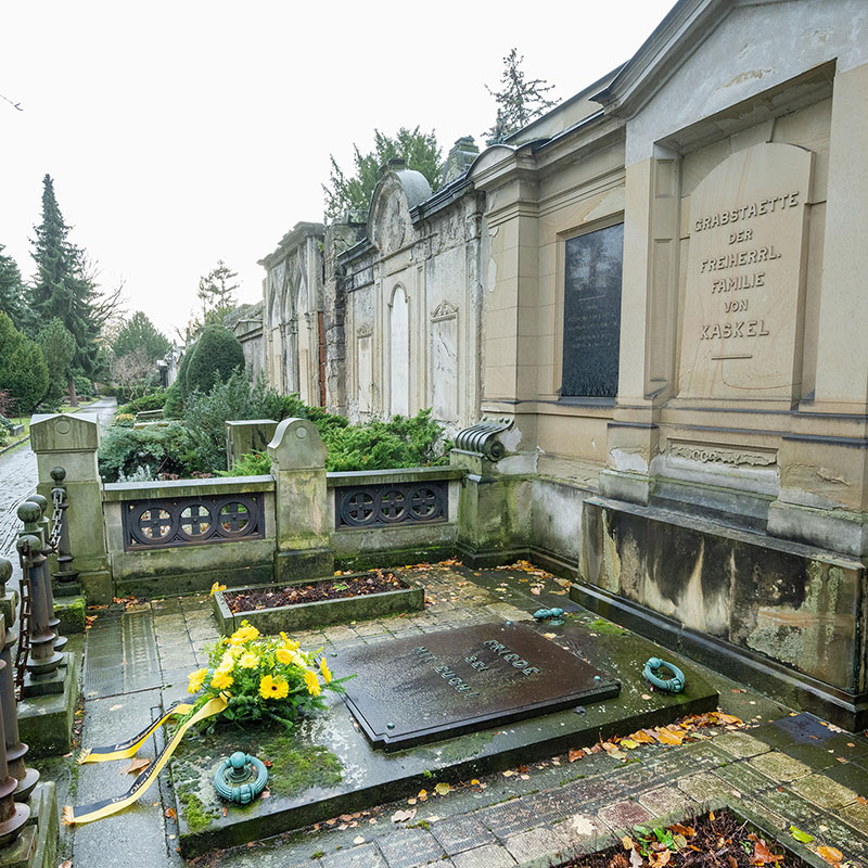 Zum 150. Mal jährt sich der Todestag des Bankiers und Stifters Carl Freiherr von Kaskel. Auch er fand seine letzte Ruhe auf dem Trinitatisfriedhof. Das Bankhaus Kaskel war Hausbank des sächsischen Königshauses und und wurde 1872 in eine Aktiengesellschaft umgewandelt. Als Dresdner Bank wurde es zu einem der führenden Kreditinstitute des Deutschen Reiches und der Nachkriegszeit bis Anfang des 21. Jahrhunderts. Nach der Jahrtausendwende war die Dresdner Bank zwischenzeitlich die drittgrößte Bank Deutschlands. Von Kaskel war auch Generalkonsul von Schweden und Norwegen und Träger des Ordens der Eisernen Krone 2.Klasse.