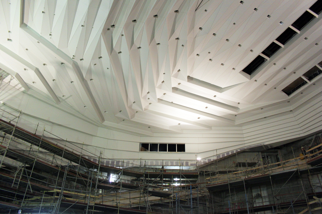 Projektleiter Thomas Puls informierte heute, 25. Mai 2016 über den aktuellen Stand der Bauarbeiten im Dresdner Kulturpalast. Im April 2017 soll der Dresdner Kulturpalast wieder eröffnet werden. Die Bauarbeiten laufen nach Plan. Im Konzertsaal sind bereits die ersten Elemente der Akustikdecke fertig. Bei einer Saalhöhe von über 22 Metern kann hier nur mit Podesten gearbeitet werden. Die oberste Stufe des Podestes ist nun abgebaut und um etwa sechs Meter nach unten versetzt worden, damit die Saaldecke weiter vervollständigt werden kann. Nun ist ein erster Blick auf den Saalhimmel frei.