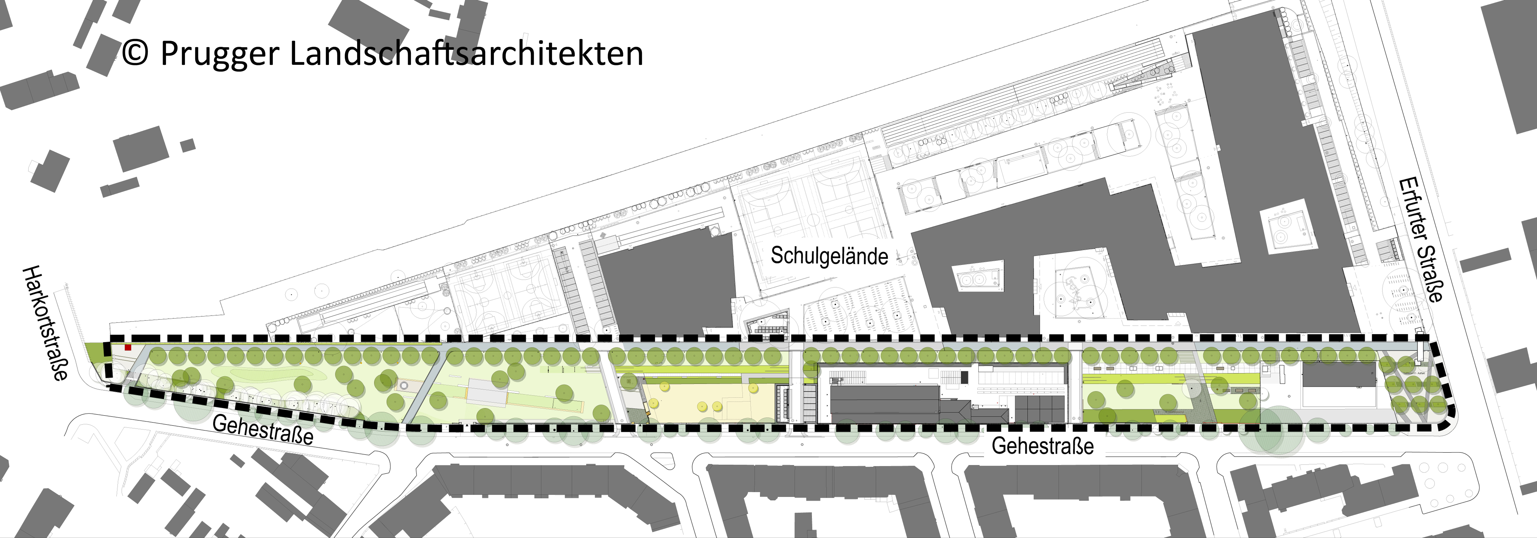 Zwischen der Grünanlage und dem Schulgelände ist ein öffentlicher Geh- und Radweg geplant. Unterbrochen wird die Grünfläche durch drei Zufahrten zum Schulgrundstück und durch zwei gemeinnützige kulturelle Einrichtungen mit deren Außenflächen, dem Verein Geh8 Kunstraum und Ateliers e. V. sowie dem denkmalgeschützten Gebäude an der Erfurter Straße. Mit öffentlichem Grün soll das Gebiet städtebaulich aufgewertet, die Aufenthaltsqualität gesteigert und die Umweltsituation verbessert werden. Vorgesehen sind neben Pflanzzonen auch Spielbereiche, Treffpunkte und ein Bürgergarten.