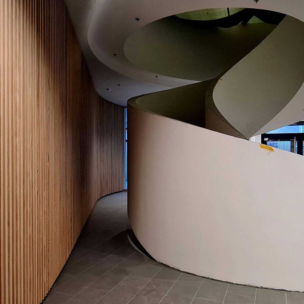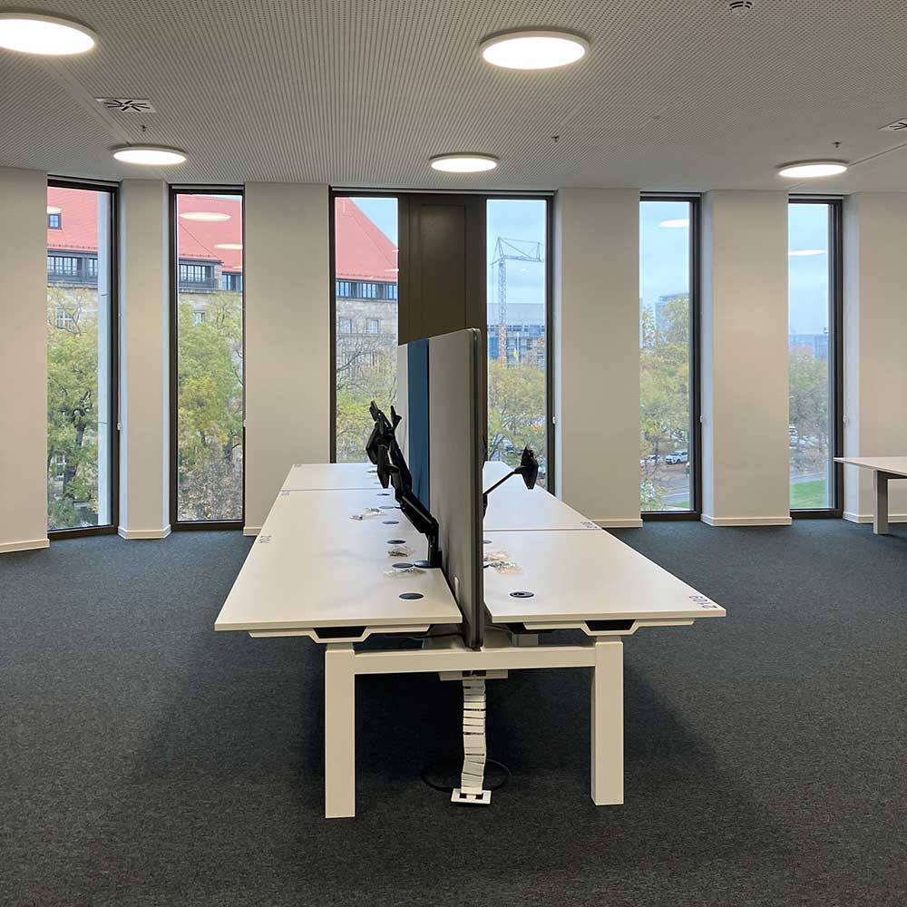 Im Stadtforum wird zunehmend digital gearbeitet. Auf fünf Büroetagen gibt es etwa 1.000 Arbeitsplätze - für rund 1.500 Beschäftigte. Dazu kommen neue Arbeitsbereiche wie Denkräume und Arbeitsinseln, die es in einer klassischen Zellenbürostruktur nicht geben würde – ein Rahmen für die Stärkung der gemeinsamen ämterübergreifenden Projektarbeit. Durch Flächenüberlagerungen können zudem rund 17 Prozent Bürofläche und damit Energie sowie CO2 eingespart werden.