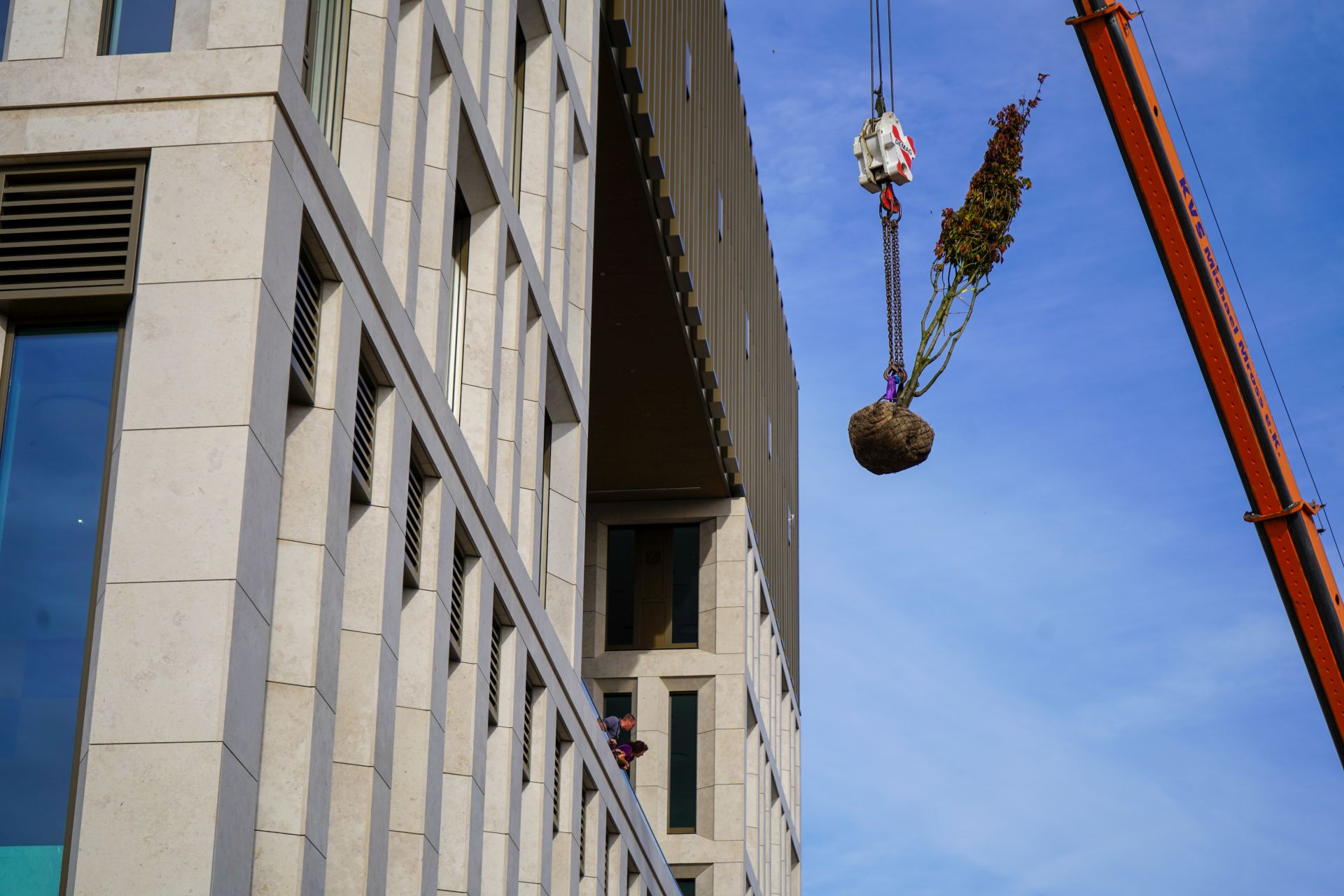 Die beiden Innenhöfe des neuen Stadtforums am Ferdinandplatz erhielten im Oktober eine intensive Dachbegrünung mit Bäumen, Stauden, Kleingehölzen und Blumenzwiebeln. Insgesamt elf Bäume mit einer Größe von bis zu drei Metern wurden auf den Dächern der Konferenzebene angeliefert. Dabei kam ein Hubsteiger zum Einsatz. Die Bäume sind japanische Blütenhartriegel, die wundervolle Blüten ausbilden, und Spindelbäume, die sich im Herbst rot färben. Zudem wurden insgesamt rund 1.500 Blumenzwiebeln und 500 schattenliebende Stauden gepflanzt.