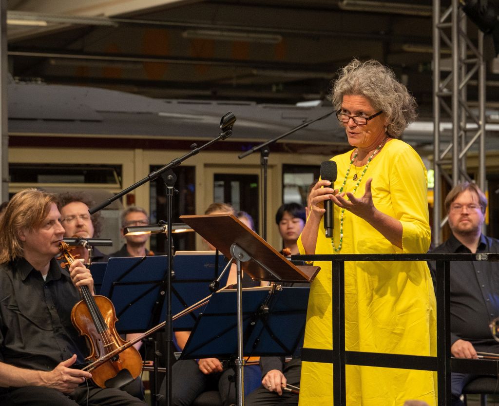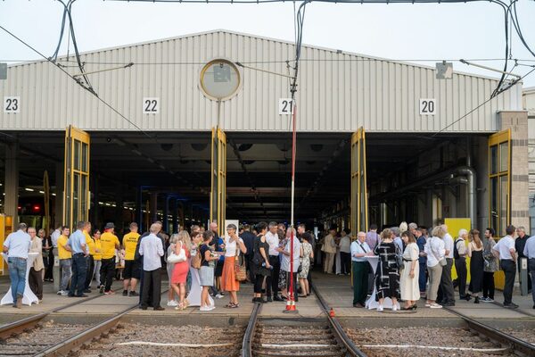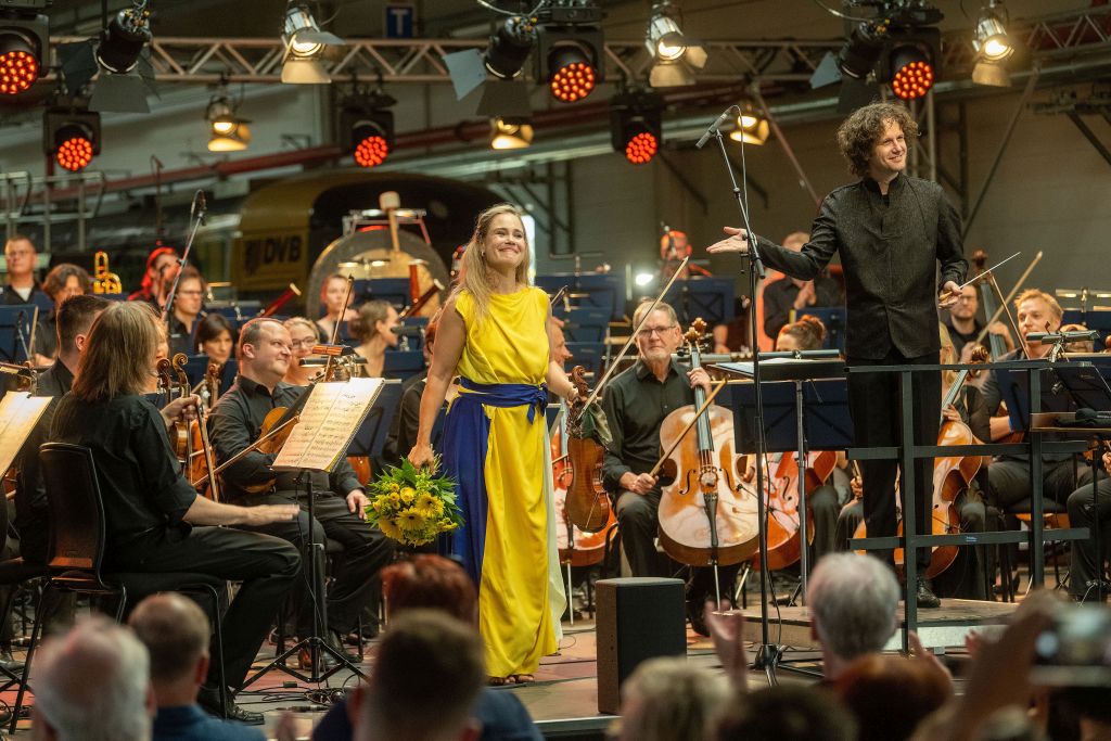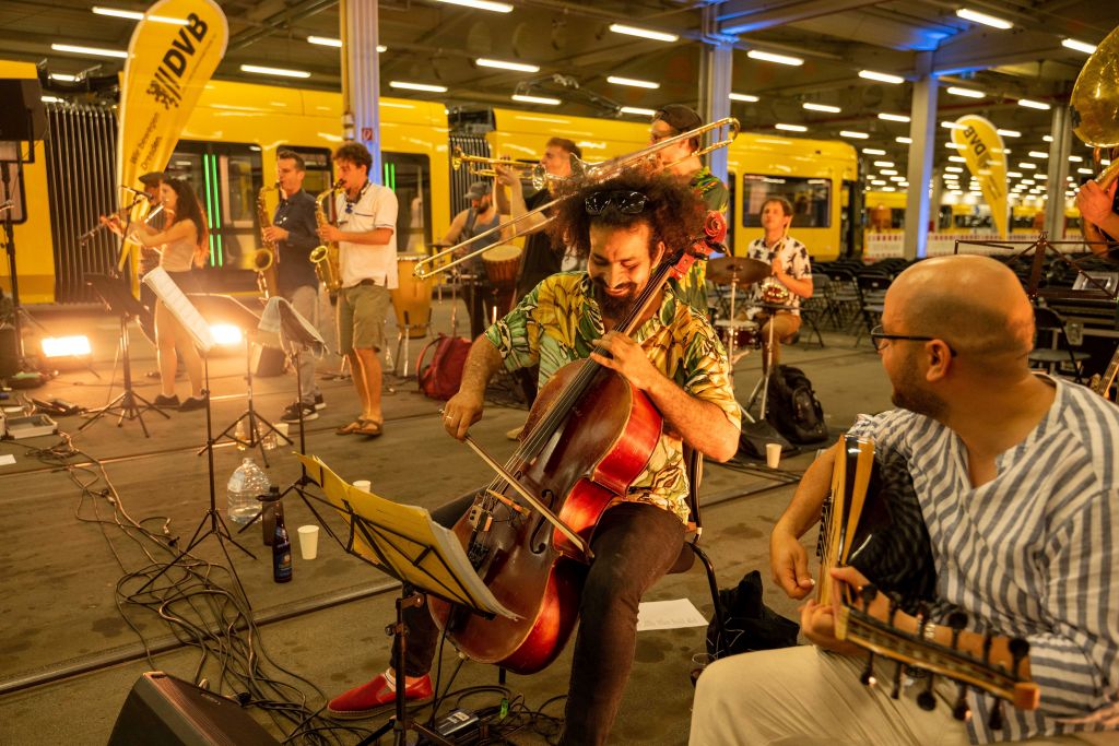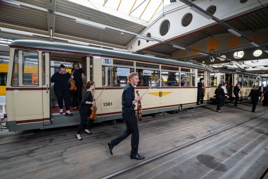 Der Ehrenamtlichen-Empfang im Straßenbahnhof Dresden-Gorbitz hatte noch einen besonderen Jubiläums-Hintergrund: Die Dresdner Verkehrsbetriebe feierten 150 Jahre Straßenbahn in Dresden und die Dresdner Philharmonie lud zum Konzert an diesem ungewöhnlichen Ort. Dazu reiste das gesamte Ochester mit allen Musikerinnen und Musikern mit einem Lowa-Dreiwagenzug an.