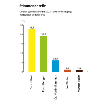 Mit 43,5 Prozent der Stimmen ist Dirk Hilbert für weitere sieben Jahre als Oberbürgermeister gewählt. Auf Platz zwei liegt Eva Jähnigen mit 38,3 Prozent, auf Platz drei Dr. Maximilian Krah mit 12,2 Prozent. Jan Pöhnisch erhielt 2,2 Prozent und Marcus Fuchs 2,0 Prozent.