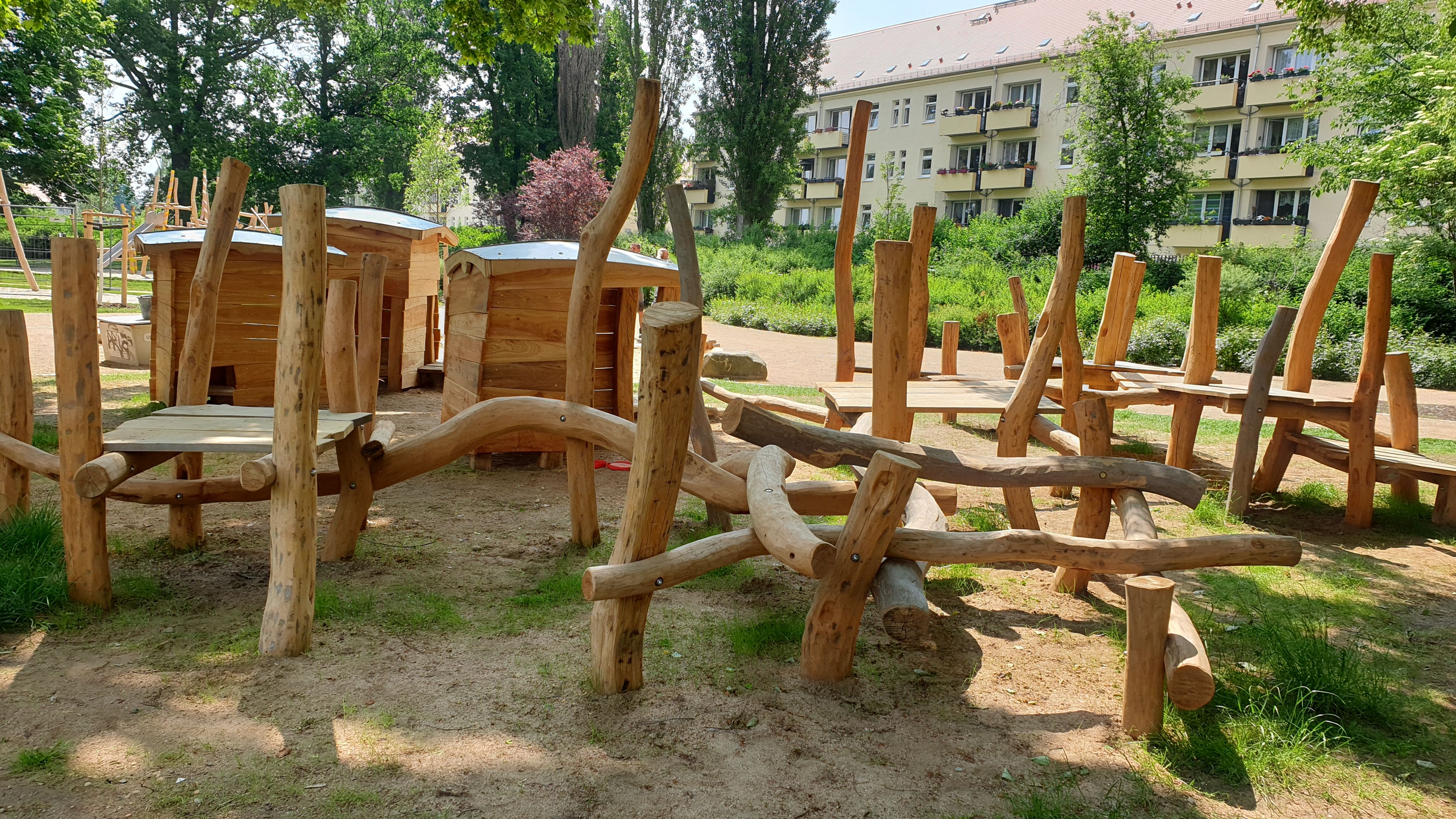 Alle Spielgeräte sind aus Naturmaterialien frei konzipiert. Dafür führte das Amt für Stadtgrün und Abfallwirtschaft zunächst eine Kinder- und Elternbefragung zu deren Wünschen und Vorstellungen neuer Spielgeräte durch. Im Anschluss folgte ein Spielgerätewettbewerb, welchen das Atelier für Holzgestaltung und Restaurierung Michael Grasemann gewann und in Folge den Auftrag für die Gestaltung der Spielgeräte erhielt. Die begleitenden Garten- und Landschaftsbauarbeiten führte die Firma Natur und Stein Landschaftsbau GmbH Dresden aus. Für mehr Schatten auf dem Spielplatz sollen in Zukunft ein Tulpenbaum, zwei Eichen und ein Urweltmammutbaum sorgen.