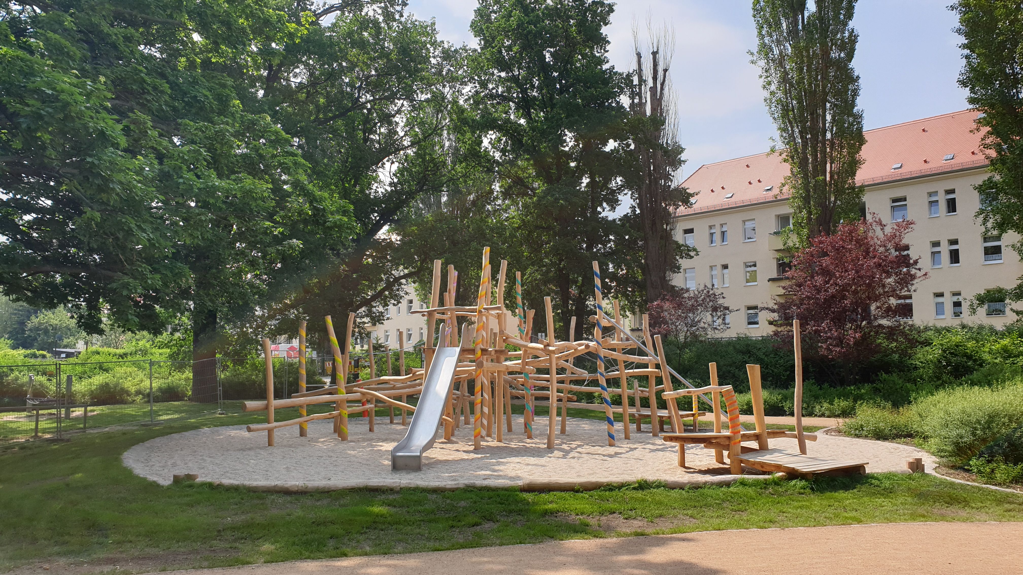 Das Büro Kretzschmar und Partner – Freie Landschaftsarchitekten plante im Auftrag des Amtes für Stadtgrün und Abfallwirtschaft die Aufwertung des Spielplatzes. Dabei blieb die gewohnte Struktur des Platzes bestehen, ebenso wie die noch intakte Seilbahn, der Drehring, die Wipp-Tiere, die Tischtennisplatten und der Jugendsitzplatz.