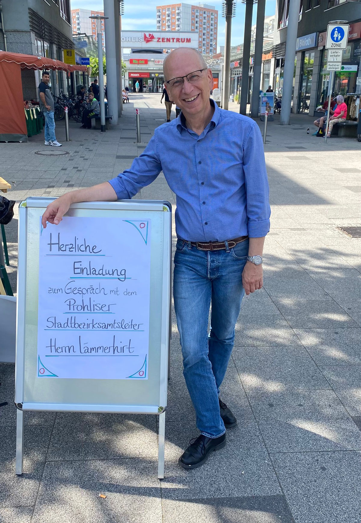 Im Format einer aufsuchenden Beteiligung besuchte Stadtbezirksamtsleiter Jörg Lämmerhirt von Juni bis August 2022 verschiedene Treffpunkte in Prohlis, um mit Prohliserinnen und Prohlisern sowie mit den sozialen Trägern vor Ort ins Gespräch zu kommen und sich zu ihren Bedarfen und Wünschen im Stadtteil zu informieren. Folgende Organisationen bzw. Orte waren dabei: