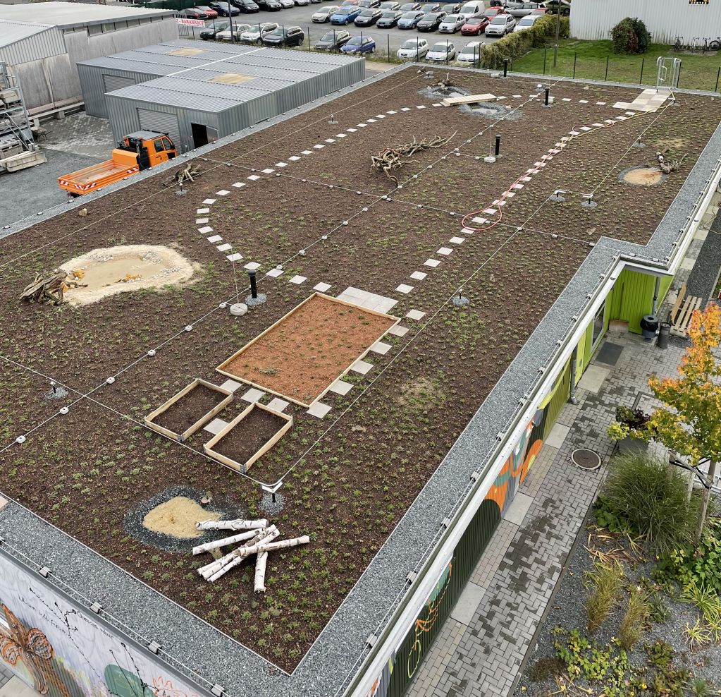 In insgesamt 370 Arbeitsstunden haben die Auszubildenden des zweiten und dritten Lehrjahres von Mitte bis Ende September 2022 die rund 400 m² große Fläche nach Vorgaben ihres Ausbilders Herrn Boedecker in ein Gründach verwandelt. Dabei wurde sich für eine extensive Dachbegrünung entschieden. Diese Variante ist für Flächen auf Gebäuden gedacht, an denen extreme Standortbedingungen herrschen, wie etwa starke Hitze und Trockenheit im Sommer, aber auch Kälte im Winter. Außerdem erfordert die extensive Dachbegrünung eine geringere Aufbaustärke, was im Hinblick auf die Statik einen wichtigen Aspekt während der Planung darstellte. Auf der Lohrmannstraße wurde eine zehn Zentimeter dicke Substratschicht eingebaut. Das Substrat ist ein besonders leichtes, wasserdurchlässiges Gemisch aus Erde und Mineralien wie Ton, Schiefer und Splitt. Unter dieser befindet sich noch eine circa zwei Zentimeter starke Schicht aus Filtervlies und Drainagematten, um den Stauden und Kräutern auch in Trockenperioden genügend Wasser zur Verfügung zu stellen. Denn eine zusätzliche Bewässerung ist für das Gründach nicht vorgesehen – nach der Anwachsphase reguliert die Anlage ihren Wasserhaushalt selbst.