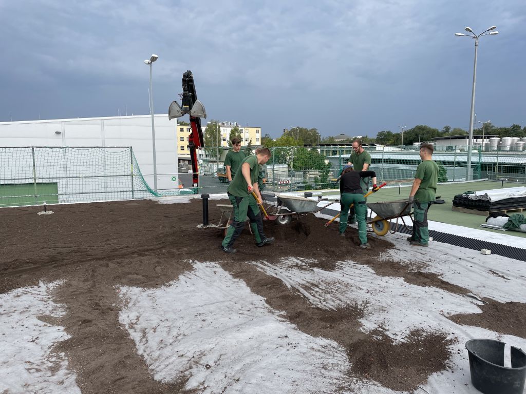 Deutlich zu warm, viel zu trocken und sehr sonnig – das ist die Wetterbilanz des Umweltamtes Dresden für 2022. Und nicht erst seit letztem Jahr müssen wir feststellen, dass das Wetter in unserer Stadt immer heißer und trockener wird. Folglich ist es unabdingbar, den veränderten Klimaverhältnissen entgegenzuwirken und auch die Ämter der Stadtverwaltung sind in der Pflicht, mögliche Maßnahmen zu ergreifen. Denn das große Ganze besteht am Ende aus vielen einzelnen Teilen. Auf 400 m² Fläche setzen nun der Regiebetrieb und das Amt für Hochbau und Immobilienverwaltung in enger Zusammenarbeit ein weiteres Zeichen für Klimaschutz und Nachhaltigkeit. Ende 2019 wurde für die Abteilung Grünanlagenpflege am Standort Lohrmannstraße ein eigener Gebäudekomplex geschaffen, um die Mitarbeitenden aus den beengten Platzverhältnissen des alten Meistereigebäudes herauszulösen. Bereits in der Planungsphase wurde durch das Amt für Hochbau und Immobilienverwaltung beschlossen, den Neubau auch für die Installation einer Dachbegrünung zu nutzen. Die Kosten für Material, Substrat und Pflanzen in Höhe von circa 13.000 EUR trug das Amt selbst, während die Umsetzung an die Lehrausbildung der Gärtnerinnen und Gärtner für Garten- und Landschaftsbau im Regiebetrieb übertragen wurde. Nach coronabedingten Verzögerungen konnten die Arbeiten im September 2022 endlich ausgeführt werden.