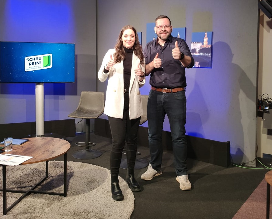Am 7. Februar 2023 drehte sich im Rahmen der Woche der offenen Unternehmen virtuell alles rund um das Thema Berufs- und Studienorientierung. Aus diesem Anlass bekamen Alexander Schmidt (Ausbilder der Studierenden) und Lucie Schoop (Auszubildende Verwaltungsfachangestellte) die Möglichkeit, bei Sachsens größter Initiative zur Berufsorientierung „SCHAU REIN!“ einmal hinter die Kulissen zu schauen und sogar vor der Kamera zu sitzen.