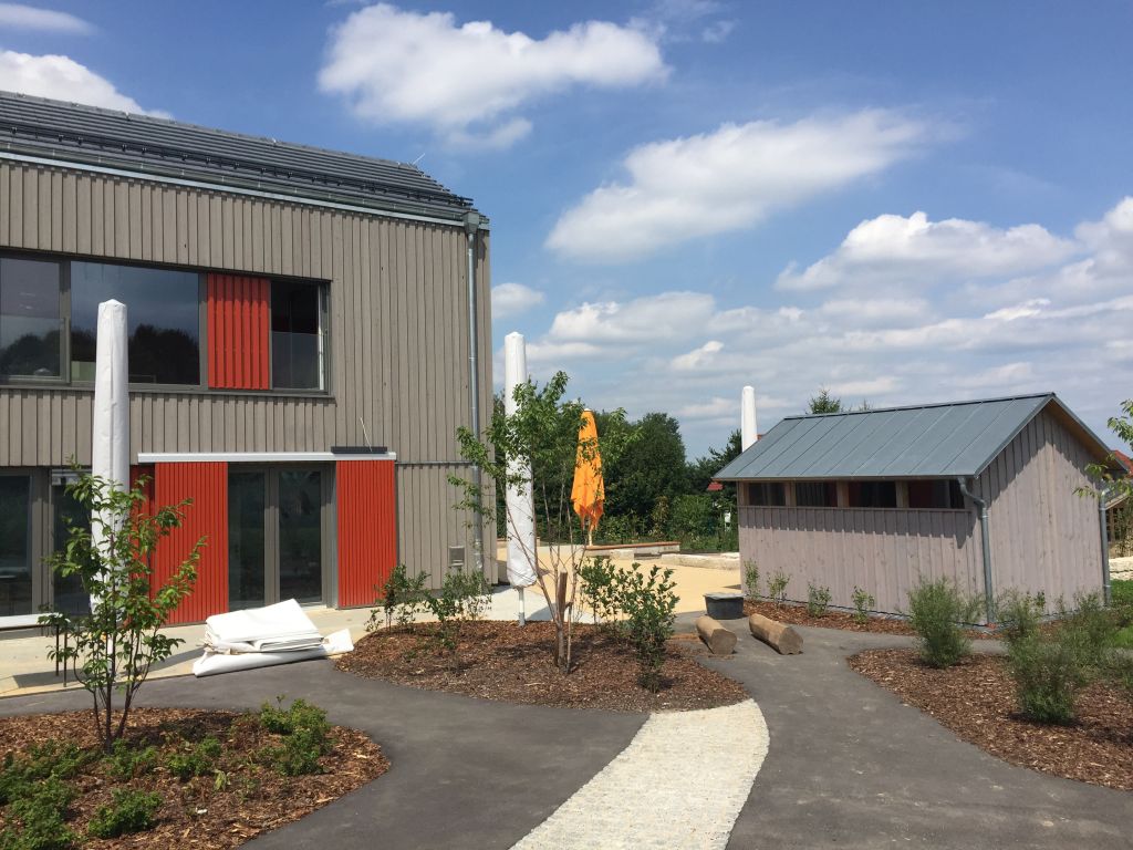 - naturnah gestaltete Freispielfläche mit Schaukel, Matschanlage, Gerätehaus, Bauplatz, Rollerbahn und Krippenspielbereich in Erweiterung der im Erdgeschoss angeordneten Gruppenräume; die Ausstattung ist zurückhaltend, nutzt konsequent Naturmaterialien und soll die Kreativität der Kinder anregen