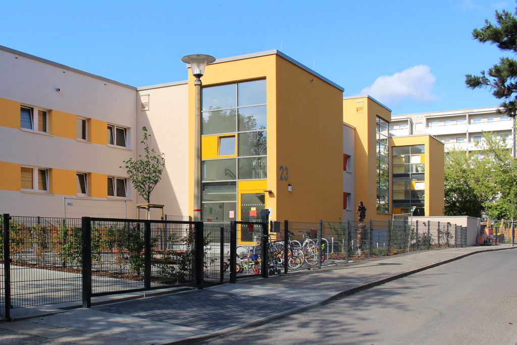 Das Bestandsgebäude im Stadtteil Gorbitz besteht aus einer Doppelkindertagesstätte des Typs WBS 70 KVSE mit technischem Verbindungsbauwerk.