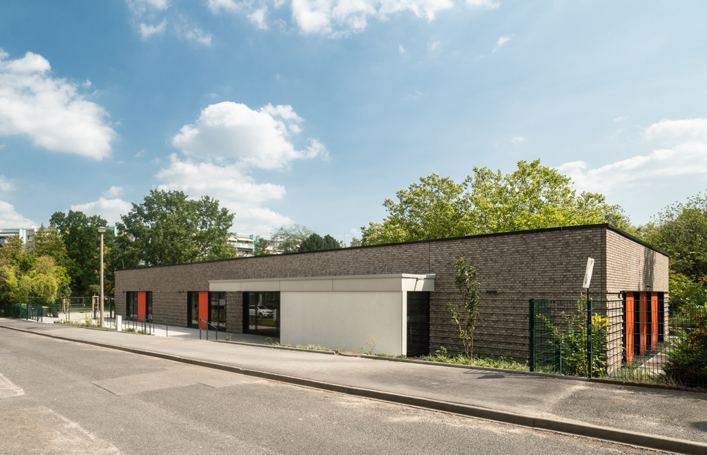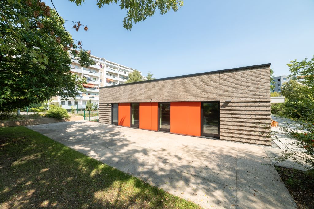 Die Fassadengestaltung mit der nachhaltigen Klinkerfassade und den orangefarbenen Fassadentafeln sind architektonisch anspruchsvoll und wecken die Neugier zu einem Besuch des Hauses.