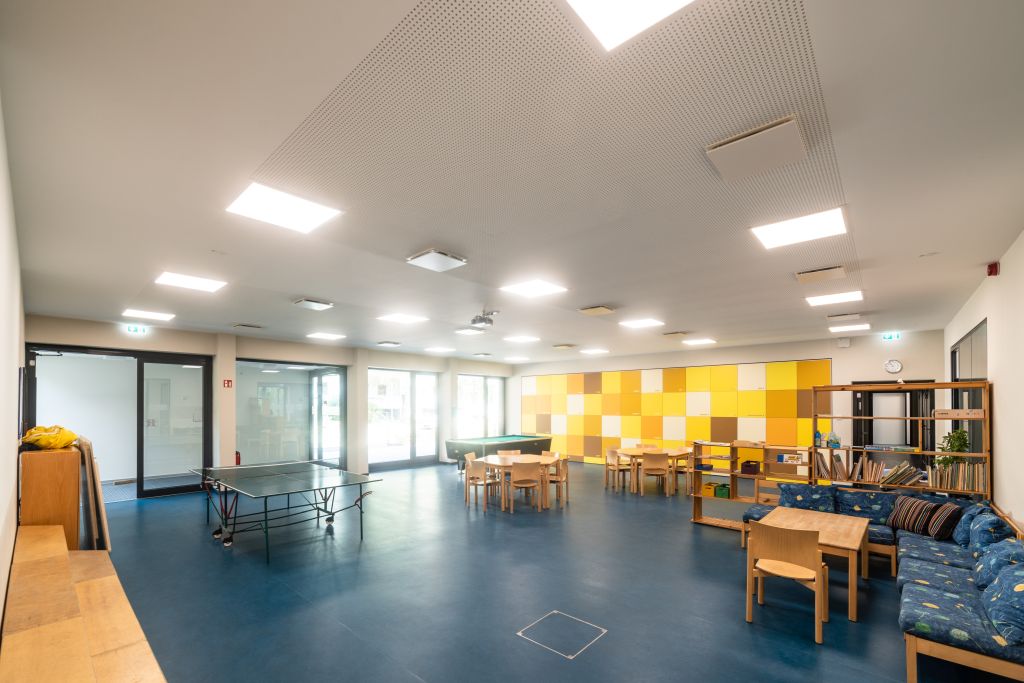 So gruppieren sich seitlich an den Mulifunktionsraum Bewegungs- und Eltern-Kind Angebote, ein PC Kabinett mit 24 Arbeitsplätzen sowie administrative Räume der Nutzerverwaltung und Funktionsräume.