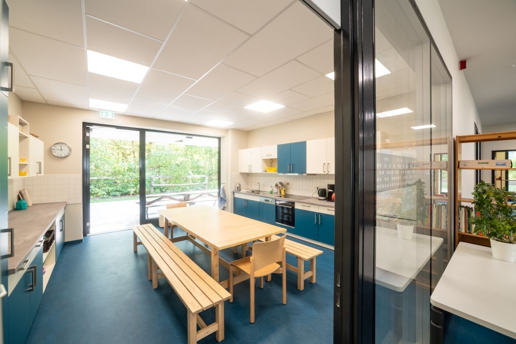 Das begrünte Dach erscheint von den höheren umliegenden Gebäuden als Bestandteil der Grünanlage. Im Zentrum des Gebäudes ist ein großer Multifunktionsraum über den alle übrigen Nutzungen erschlossen werden.