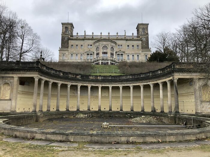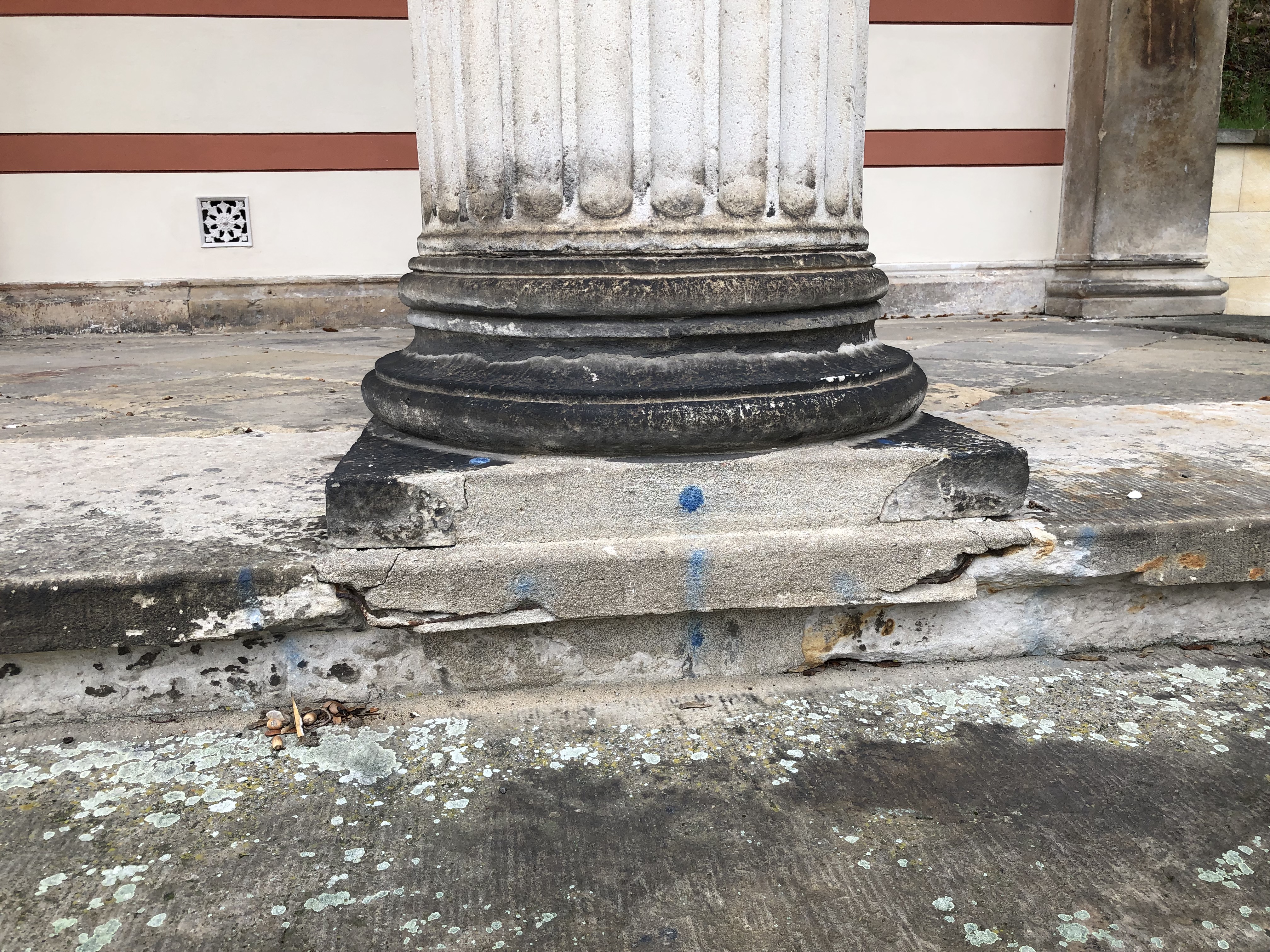 Viel. So müssen unter anderem an einem der beiden kleinen Tempel (Portikus West) der komplette Giebel mit Kreuzgratgewölbe instandgesetzt werden, Stützmauern stabilisiert sowie an vielen Stellen der Sandstein saniert werden. Die Decke oberhalb der Säulen muss abgedichtet und statisch ertüchtigt werden. Das Wasserbecken soll in seiner historischen Form wieder entstehen. Auch die Außenanlagen sollen zum Ende der Bauzeit wieder dem historischem Vorbild entsprechen.