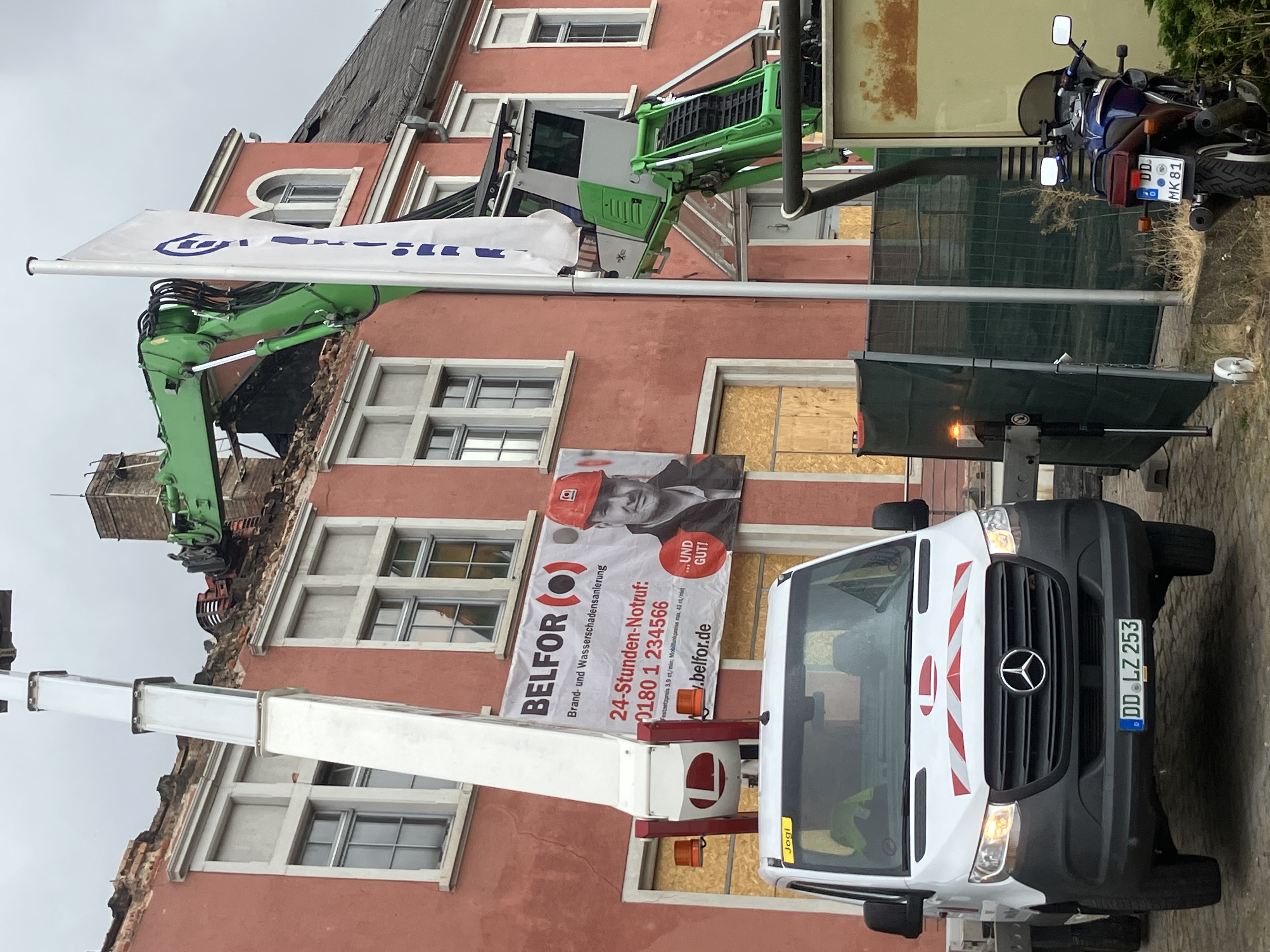 Neben den Sicherungsmaßnahmen wird derzeit durch die Sachverständigen der Versicherung ein Abbruchkonzept erstellt. Dazu fanden Anfang Juli Untersuchungen zur Statik und zu den Schadstoffen an der Brandruine statt. Um eine Aussagen zum Umfang des Abbruches treffen zu können, sind weitere Untersuchungen am noch vorhandenen Tragwerk erforderlich. Hier wird die Versicherung durch ein Dresdner Statikbüro unterstützt. Aktuell lässt sich daher noch keine Aussage zum Erhalt der durch den Brand stark geschädigten Gebäudesubstanz treffen.