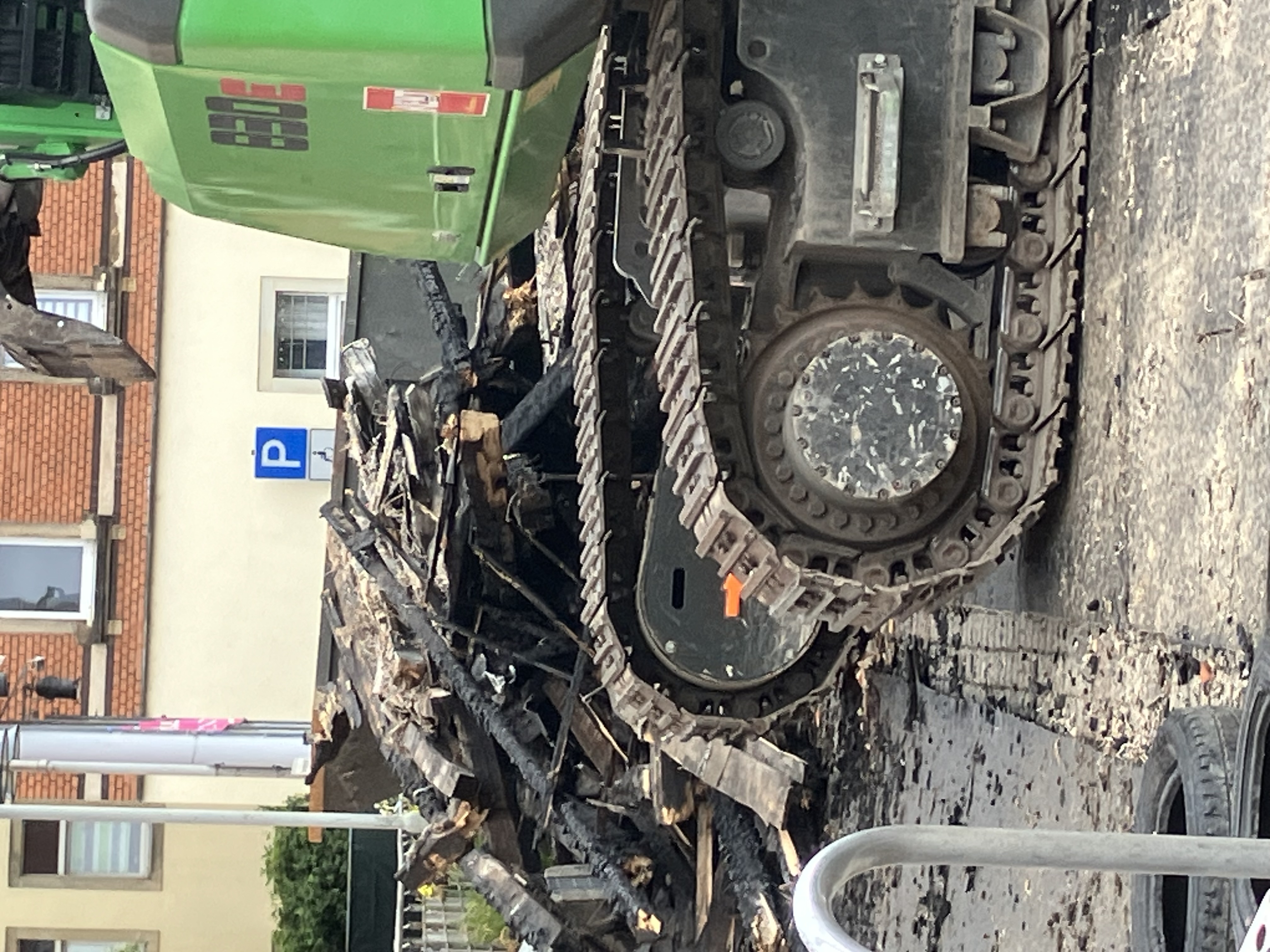 Am Dienstag, 8. Juli 2025, startete der aktive Rückbau des vorderen Daches. Im Vorfeld dieser Abbrucharbeiten wurde bereits eine Hubarbeitsbühne eingesetzt, um die losen Teile zu bergen. Dazu zählen Dachschindeln, Verblechungen und Teile der Dachrinnen. Mit der Arbeitsbühne wurde auch geprüft, auf welche Weise der Abbruch des Schornsteins und der Giebelwand erfolgen kann. Für den Rückbau des Schornsteines und der Giebelwand zum Bühnenraum kommt nun ein sogenannter "Langarmbagger" zum Einsatz. Der Antransport dieser Großtechnik muss durch die Straßenverkehrsbehörde genehmigt werden. Diese Genehmigung wurde erteilt und das schwere Baugerät kann seine Arbeit beginnen. Der Abbruch wird voraussichtlich zwei bis drei Wochen in Anspruch nehmen.