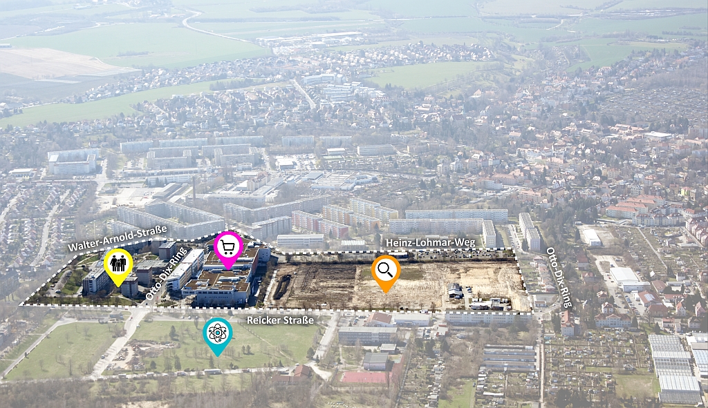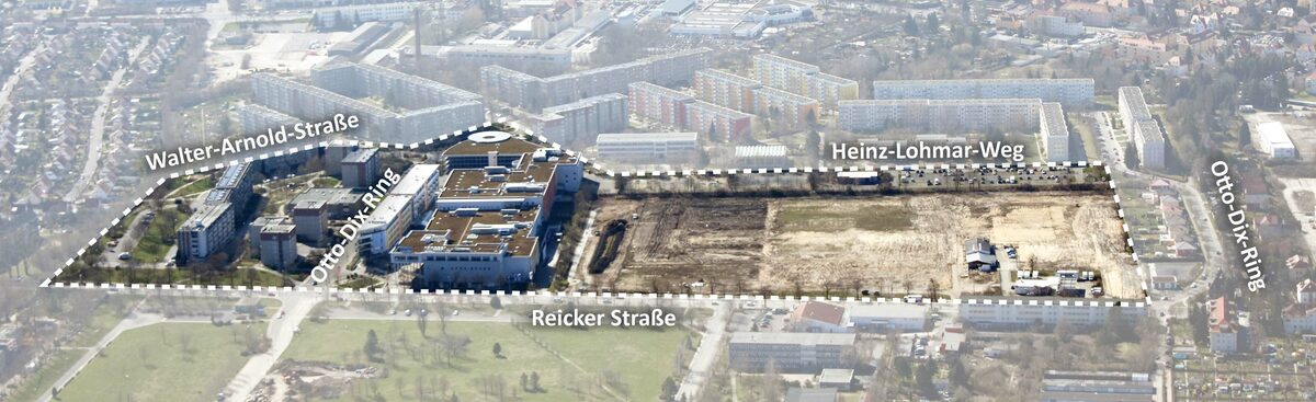 Das gesamte Gebiet des Bebauungsplanes Nr. 3075 (auf der Karte in blau) umfasst eine Fläche von 11,5 Hektar. Parallel wird auf der gegenüberliegenden Seite der Reicker Straße der Wissenschaftsstandort Dresden-Ost entwickelt. Hiervon sollen ebenso positive Auswirkungen auf das neue Otto-Dix-Quartier und den gesamten Stadtteil ausgehen.